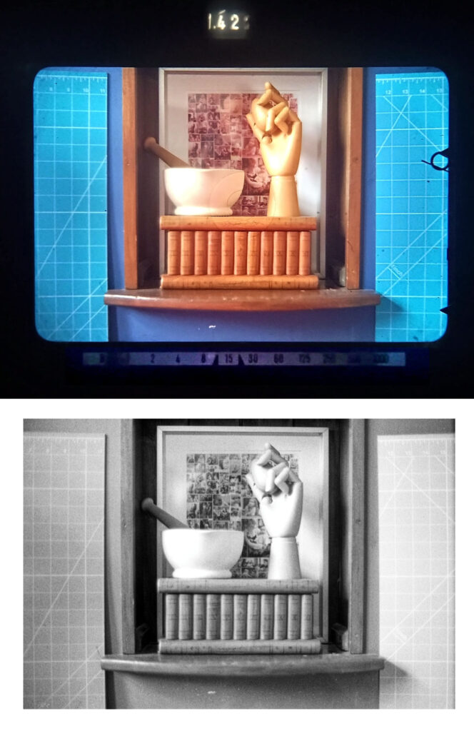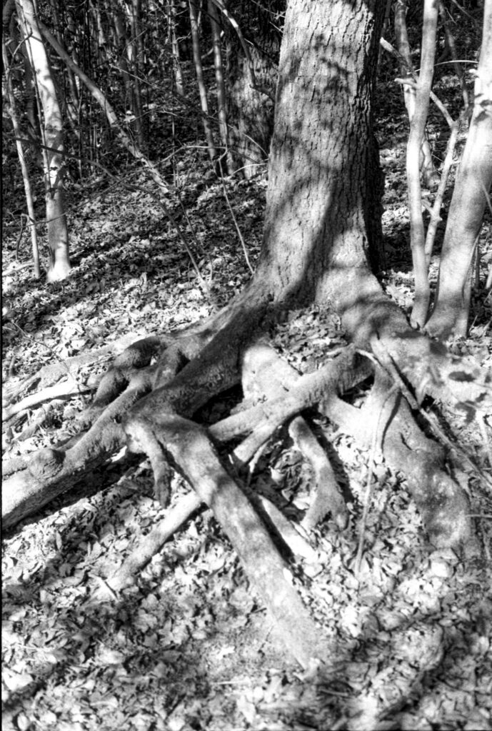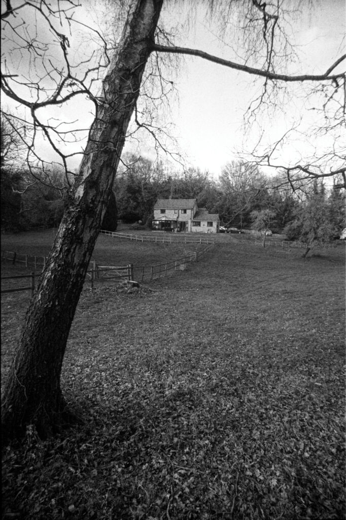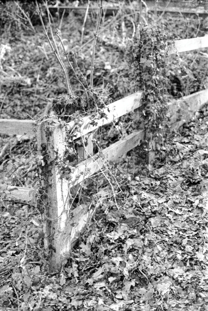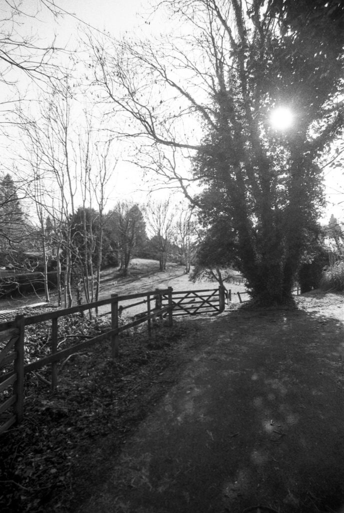 I was working out quick fixes for the clutch on the take-up spool while the film was getting its final rinse and soak. When I hung the film up I saw four or five missing shots from the middle of the roll. I remembered that, at that point, I’d been doing quite a lot of silhouette-type shots, with the winter sun fully visible, and for which the shutter speed was set high.
