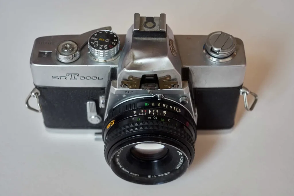 In 1973, Minolta introduced an enhanced SRT. It had a split-image focus aid to go with the microprism, a modern hot-shoe, a full information viewfinder, a modified top plate, and a multiple exposure feature. The enhanced model was called SRT 303 in Europe, SRT 102 in the Americas, and SRT Super in eastern markets; I’m just going to refer to all these enhanced SRT cameras (and their later variants) as 303-type from here on.