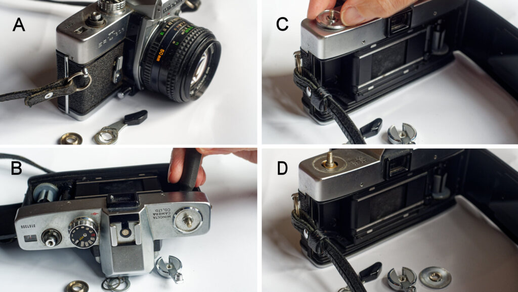 I think the 303-type is a better-looking camera than the 101. Its top plate design just looks nicer to me. Six years separate the 101 and the 303. As well as accommodating the aperture direct window, the bevel on the front and rear edges of the top plate has gone, making it look more modern. I’ve previously maintained that the 303-type top plate was better made. I’ve seen a fair few SRT 101 top-plates. Almost all have dents on one end or another, but with the notable exception of my ‘Mind of Minolta’ strip-down example, the 303-type top plate appears to suffer less from damage. My sampling may be unrepresentative, but in my experience, the 303-type top plates seem to hold up better.