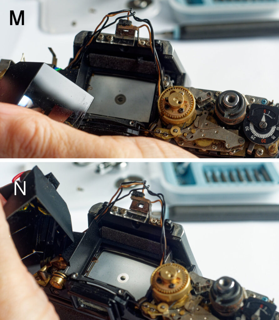 I did consider transferring the 303-type prism, aperture direct window, and mirror arm to a 101 body, but as my 101 cameras predate the 303-type they are not likely to have the drilled and tapped holes for attaching these parts. It is not easy to tell for certain, as the bit of the body that would be drilled is covered by the front plate on the 101. Removing the front-plate means taking off the bayonet, which is not for the faint-hearted. It might be possible to drill and tap the holes, or even to use adhesives to stick the mirror arm in place, but different photocells might require recalibrating the meter. All in all, it is quite a lot of modification just to see the aperture in the viewfinder.