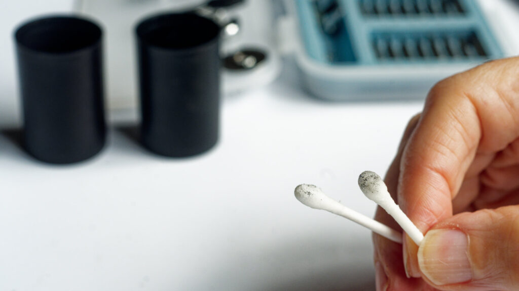 With the pentaprism moved to one side, I blew any remaining debris out of the chamber above the focusing screen and cleaned the underside of the focusing screen with hot water and a bit of detergent on the end of a cotton bud.
