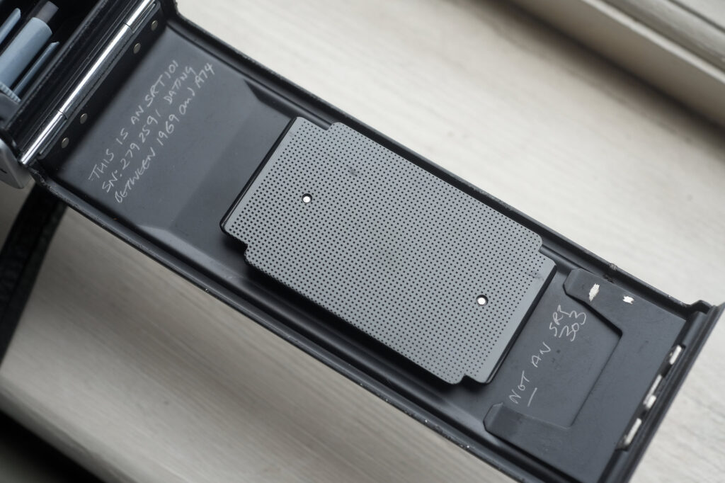 In the interim, I’ve decided to go a simple (and purely cosmetic) route. My remaining original SRT 101 will trade in its dented top plate for a cooler-looking 303 number (which it may only have on loan). I’ve written explanatory notes and the proper serial number in the back of the receiving SRT 101.