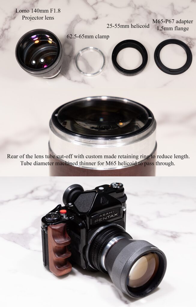 In the everlasting quest for large apertures on 67 format, the path to glory leads towards projector lenses. Among these, the Soviet Lomo 35KP 140mm F1.8 movie projector lens stands out for its affordability and quality. There are two versions of Lomo 140mm F1.8, a slender model with Petzval optics and a fat model with double-Gauss design. Only the fat one has a flange distance compatible with Pentax 67.