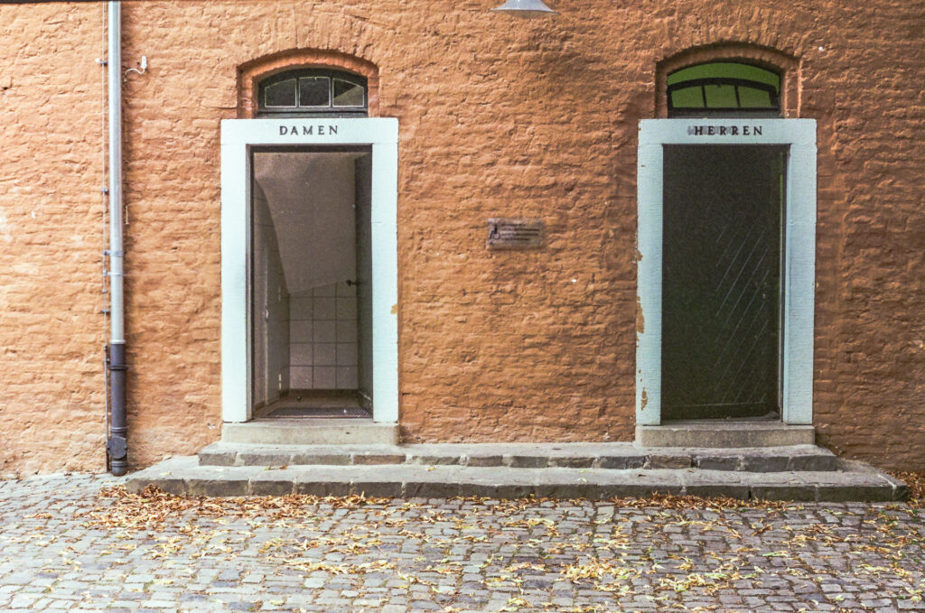 Here you can see the rear of the Rheydt Castle mansion in Mönchengladbach with its arcade. On this particular Monday, the museum housed there was closed, so there were only a few visitors. After my first publication here in 35mmc, there were comments about the few people pictured. I must say that it has become difficult to photograph people in Germany. According to EU and German law, consent must be obtained for both photography and publication. When you ask, you usually don’t get permission. A country without people is hard to imagine when I look at the old picture books by American photographers and Henry Cartier-Bresson.