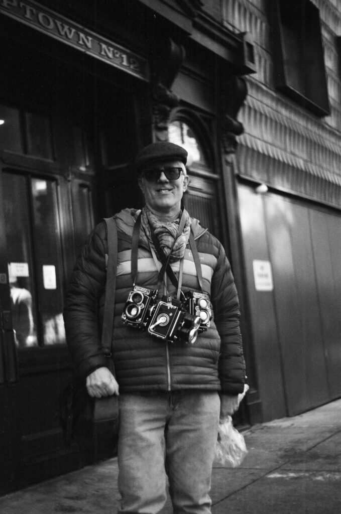 As my last shot of the day, I grabbed a portrait of David with his Rolleiflex collection in front of the coffee shop.