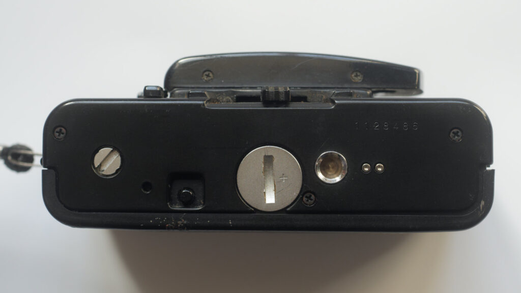 The Cosina is 4mm higher, 9mm deeper and 5mm wider than a closed Minox 35 EL (so a little bigger all-around than the Olympus XA2). The swiveling cover gives good access to the little focusing lever positioned under the lens. Here you can see the four distance settings – infinity, 3m, 1.5m and 0.9m. The rotating cover on this particular CX-2 still operates very well after 45 years of use.