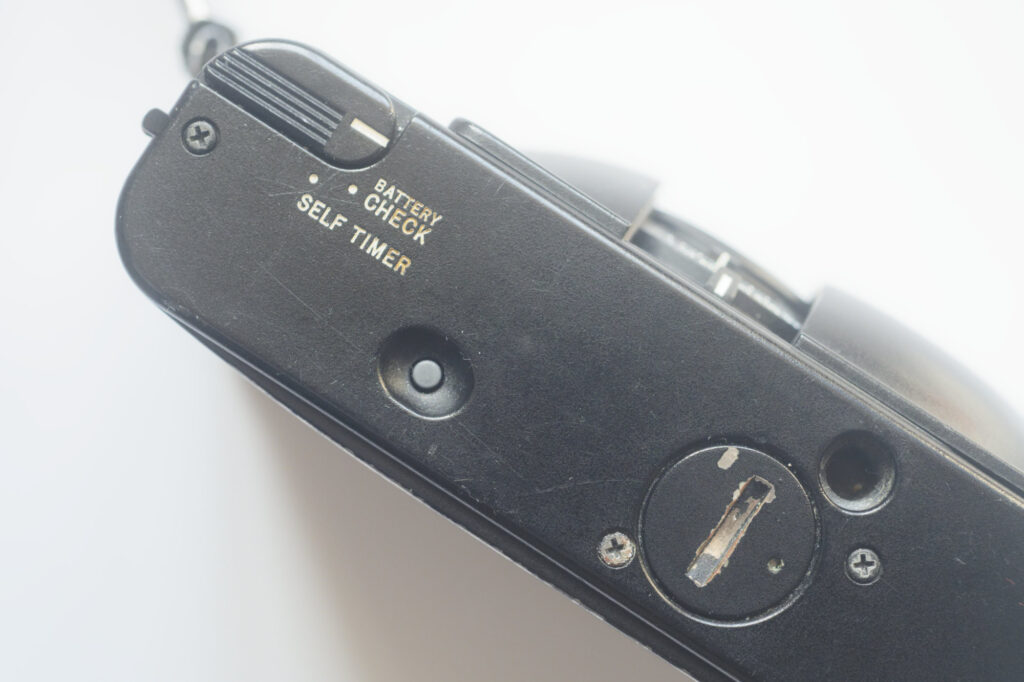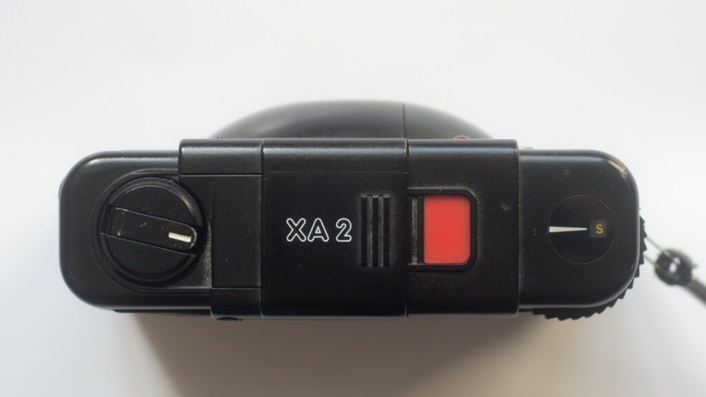 In a nice touch, when set, the self-timer lever makes a little ‘foot’ sticking out the front of the camera. This widens the centre of gravity when the camera is positioned on a wall or table. In the XA3 and XA4 this control also included a backlight compensation position (dealing with one of my few gripes).