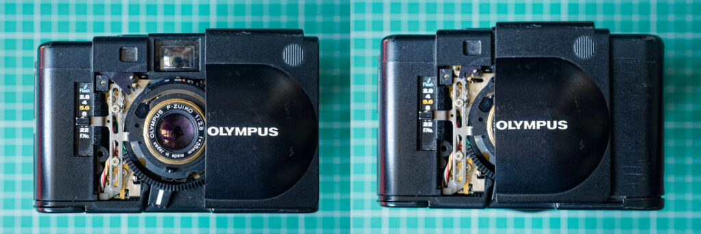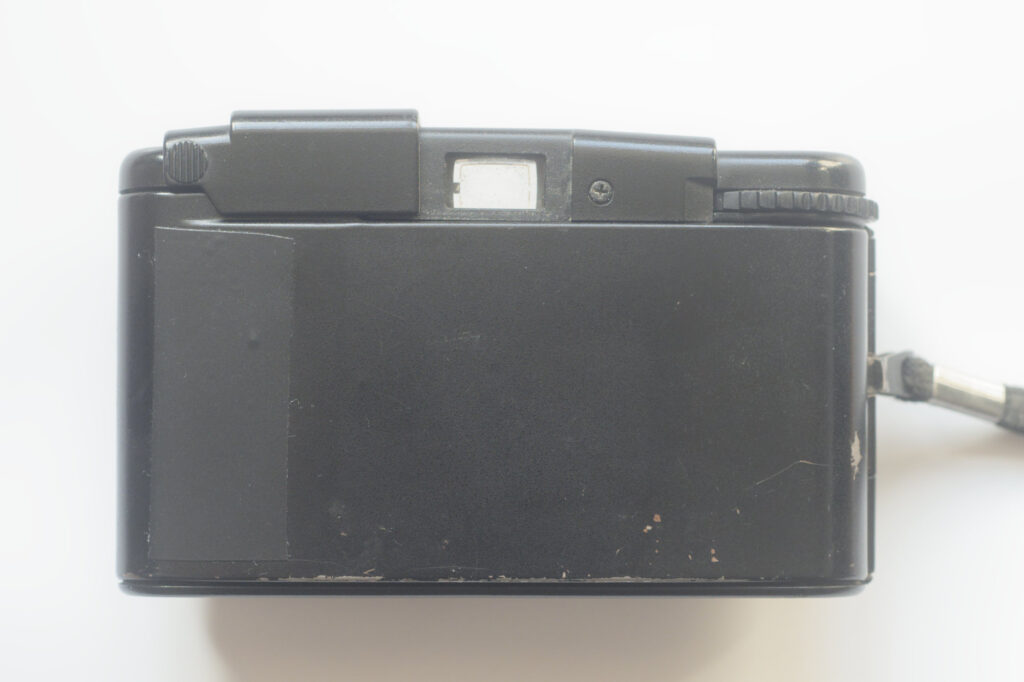 The Olympus XA2 is 2mm higher, 7mm deeper and 4mm wider than a closed Minox 35 EL. In a nice touch, closing the clamshell door sets the focus back to the middle focus setting, which should be close to a hyperfocal with this lens in reasonable light. This is quite handy, as the viewfinder doesn’t give any indication of what focus is set to.