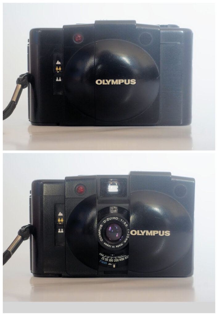Olympus brought out the XA1 (a further simplified version with a fixed-focus f/4 lens and a selenium cell meter), the XA3 (as XA2 but with a backlight switch and DX coding), and the XA4, which featured a slightly slower (f/4) lens with an interesting 28mm focal length. The clamshell designs lived on in the Mju series and even into the early Olympus digital cameras.