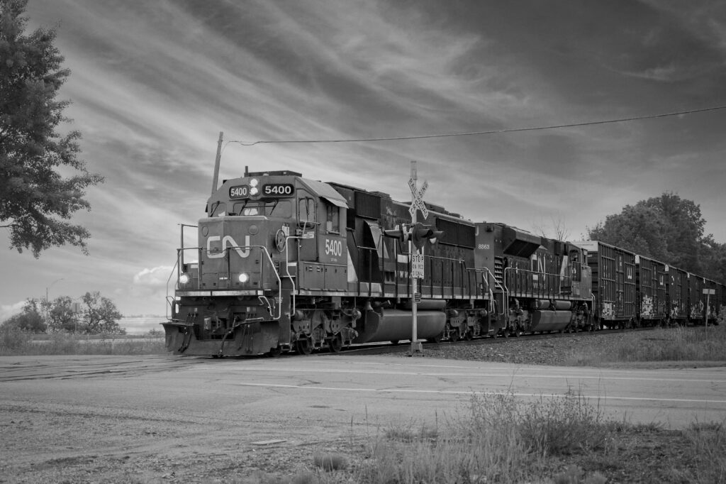 Photographing trains isn’t just about the trains themselves—it’s about context. They bring texture to rural fields, grit to city sidings, and structure to a landscape. In this photo, the bold red of the CN engine cut through the muted tones of winter. You can almost hear it coming before it arrives, the low hum turning into a full roar as it passes overhead. I was teaching a photo class and it was bone cold out, I was ready to head hope. A student knocked on my truck window and said a train was coming so I forced myself to get out and set up for a picture. I was frozen but it was well worth it.