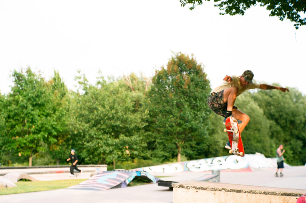 If I had any foresight, I would have ditched the board, picked up a camera, and photographed my friends, some of whom were amazing skateboarders. But it would be another 20 years before I started tinkering with film cameras and by that time my mates had all traded nosegrinds for desk jobs, midlife crises, and divorces. But this past summer I was given a second chance. One day while doomscrolling Instagram I was fed an ad about a local London, Ontario, skateboard competition, called the Kiwanis Jam. I marked down the date and then confirmed with my wife that I had the green light to be cool for a day.
