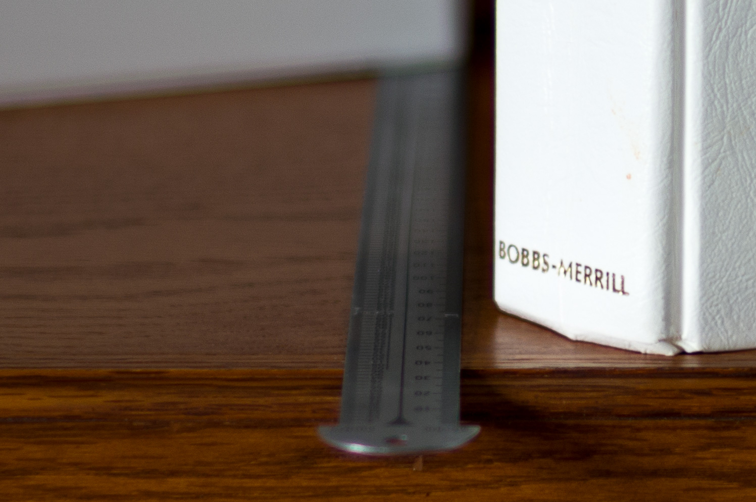 By f/4 the focus point has shifted to about 140mm on the pica pole even though I did not move the focus ring and had only changed the aperture. Looking through the viewfinder at the optical rangefinder it still read as the front edge of the book was the point of focus: