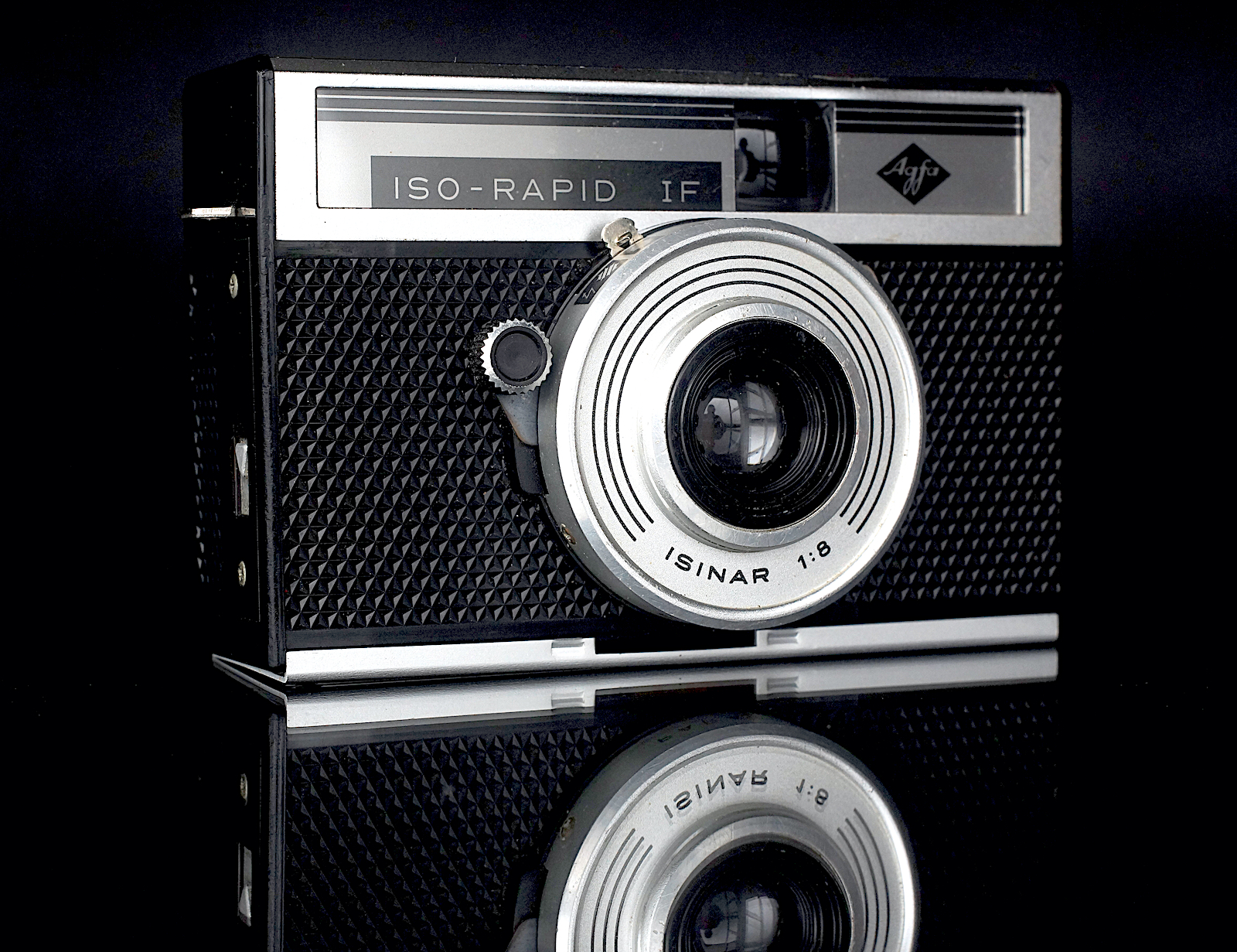 The Agfa Iso-Rapid 1F is brick-like in its body shape, every edge squared off, and light, yet feels solid. Finish is traditional black and silver but the usual leatherette is replaced with a prismatic patterned finish that is very tactile and grippy.