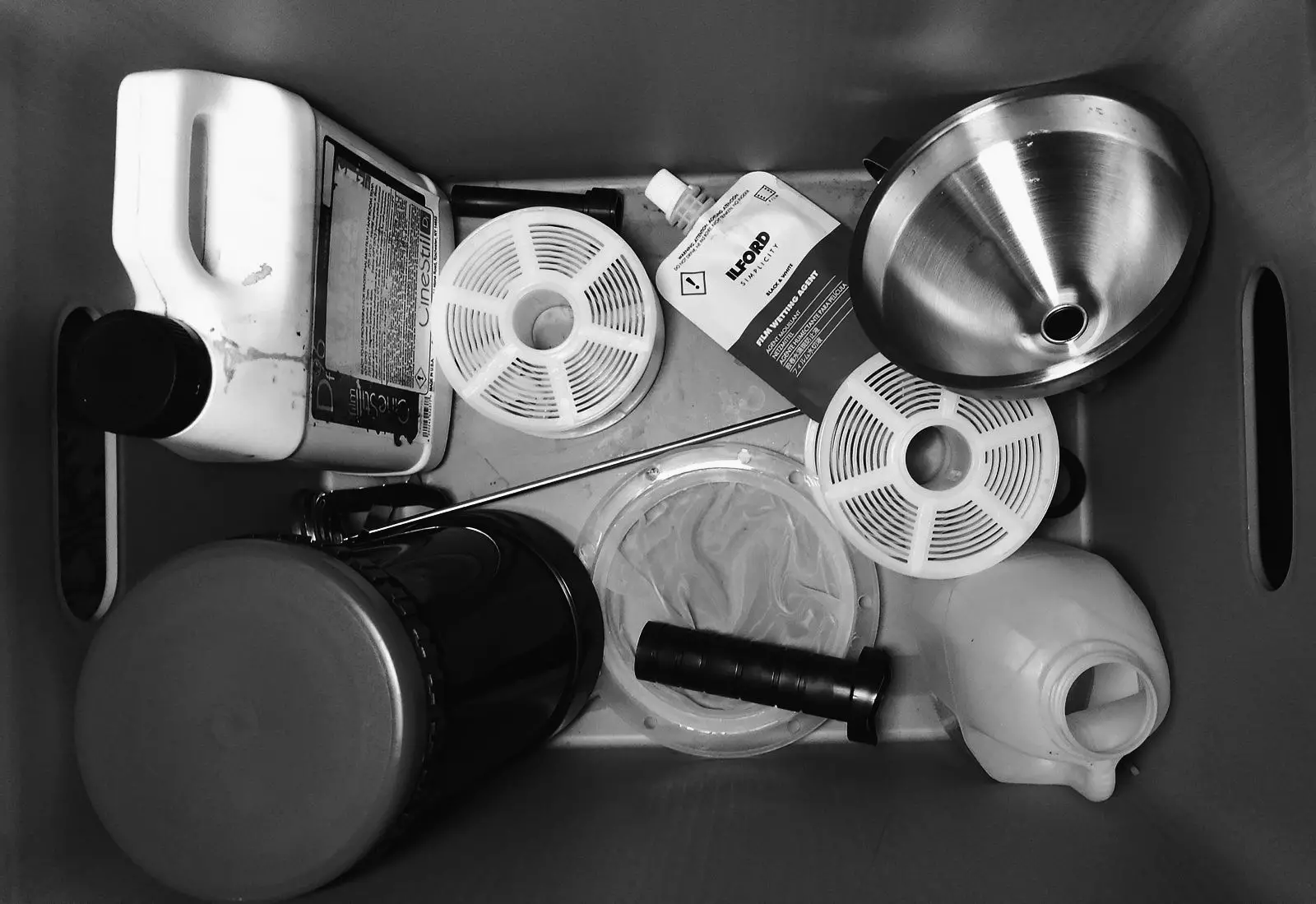 So, I took the plunge, ordering not only the monobath but all the necessary paraphernalia to go with it: AP tank with two reels, thermometer, dark bag, spool opener, funnel, wetting agent for the final wash, etc. I watched a few videos, and convinced myself that I could do this.