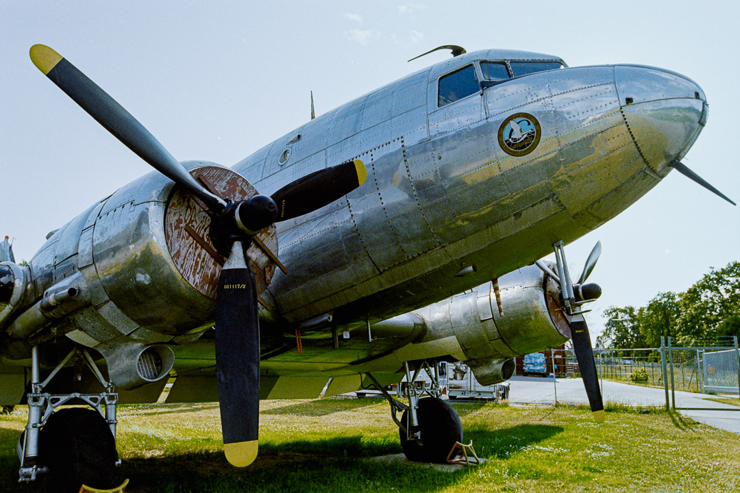 Stepping outside the main hall, the museum continues into an outdoor area where several aircraft are displayed in the open air. Natural light brings out details you might miss inside. One of the highlights outside is a Douglas DC-3, its rounded fuselage and classic lines giving it the unmistakable look of something straight out of an old war film.