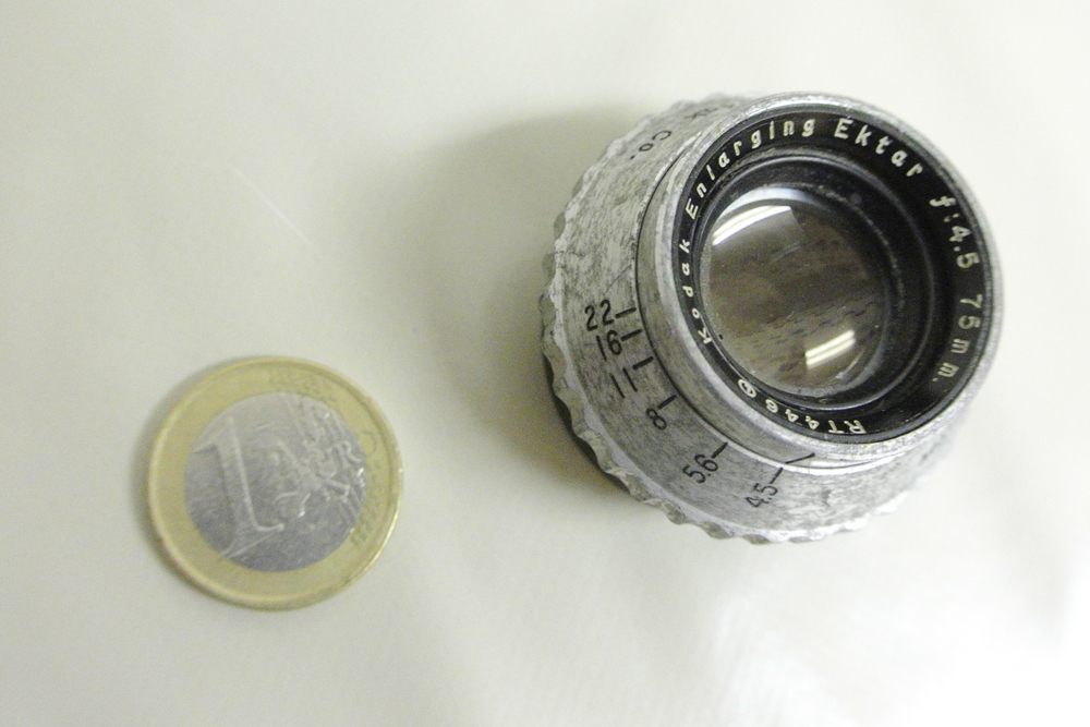 The Kodak Ektar 75mm F4.5 lens is made in the USA and should not be confused with the same lens made in the UK, which performs worse. It is a Heliar-type lens with a 5-element construction. It is very small; in the photo, it appears next to a one-euro coin.