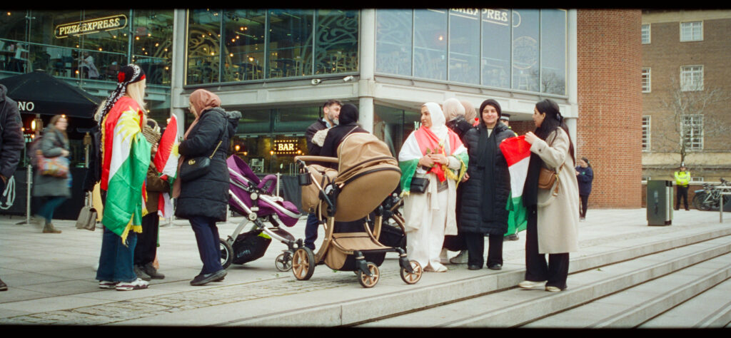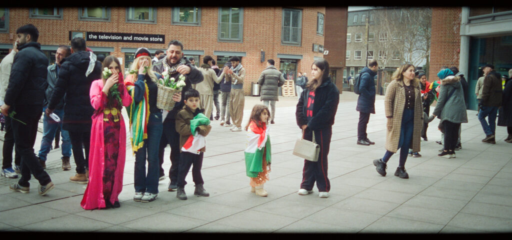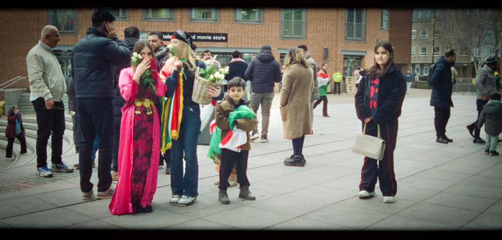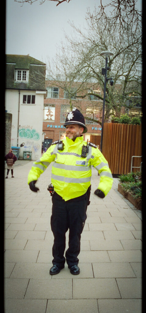 I shot urban stuff, snapshots, generally at f8 – f11 zone focus, just playing with composition and experimenting, (so these aren’t in anyway what I’d call good – just snaps and imagine how they’d be with a good lens, fine film and some care, and nor did I use a warm up filter which I should’ve with the T film balance) and was confident enough to approach a few people for portraits, even PC Plod was in a good mood as there was some kind of Kurdistan Protest going on, where I asked a few people, plus the girl in the purple dress, I approached and asked if I could take a picture of her in her pretty purple dress. There was one British Army guy, probably a Merc who accused me of being a hack, I told him to go and do one.