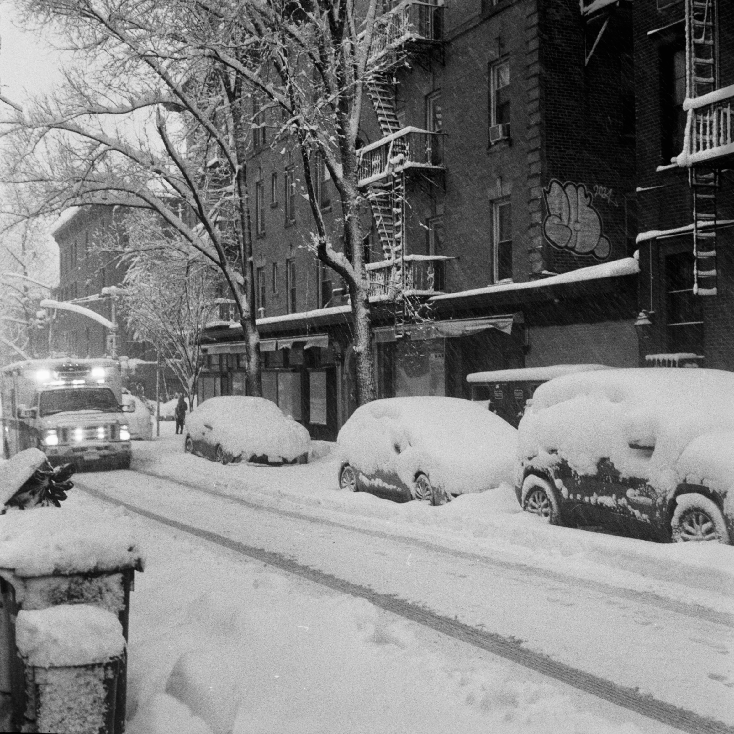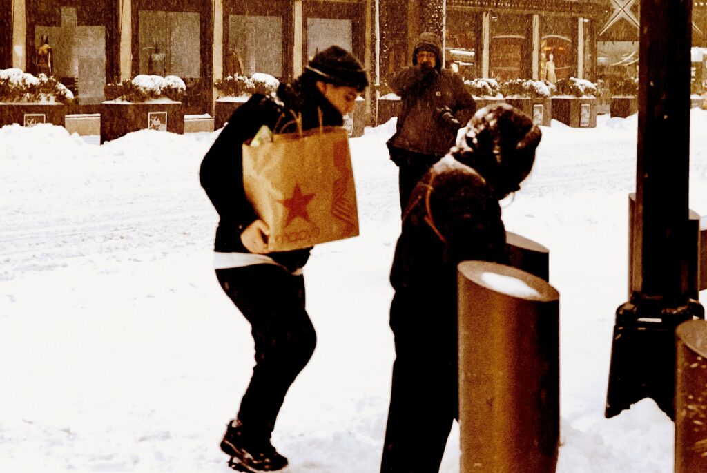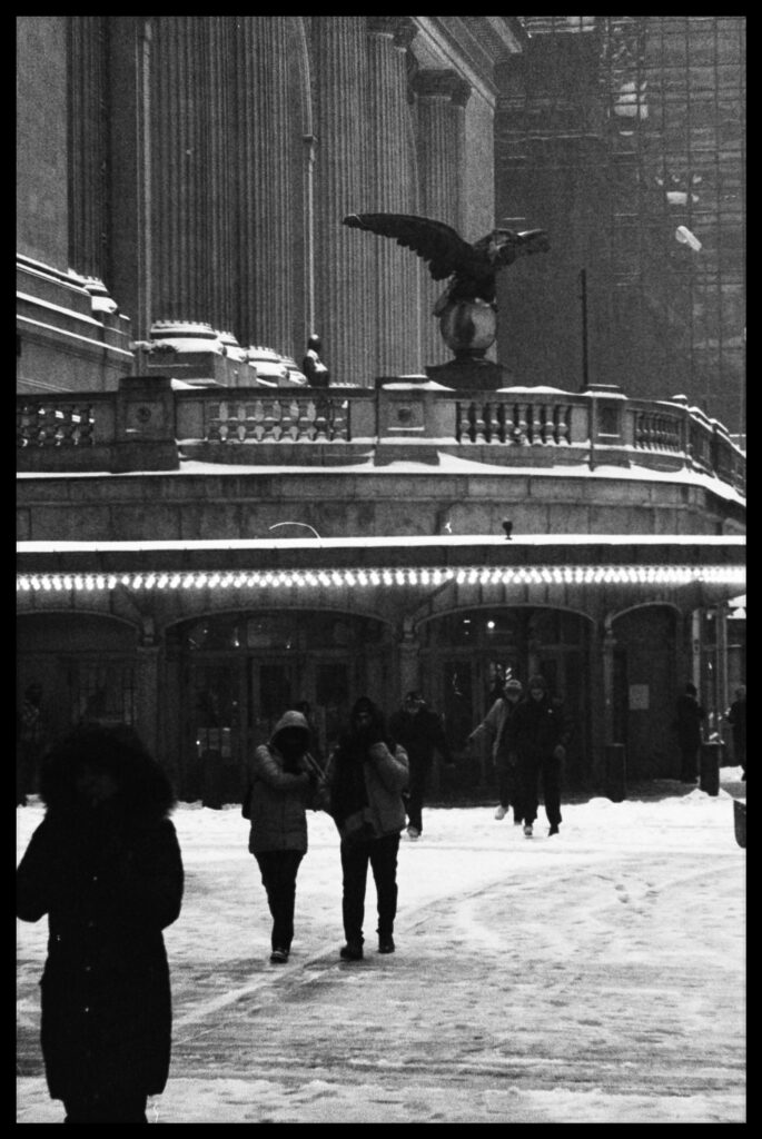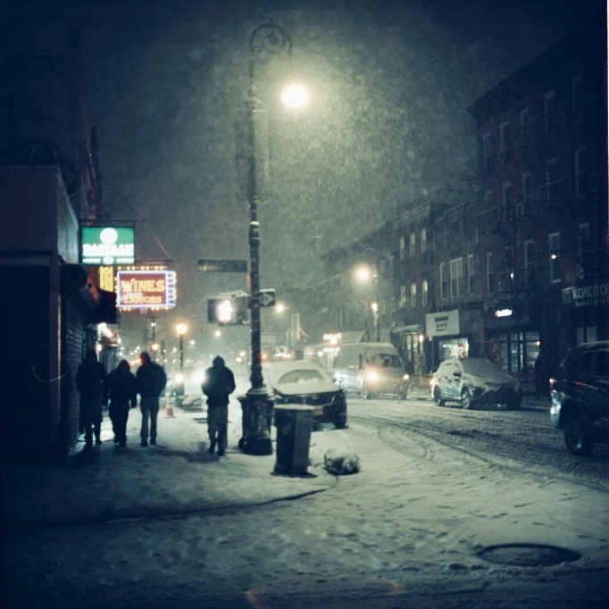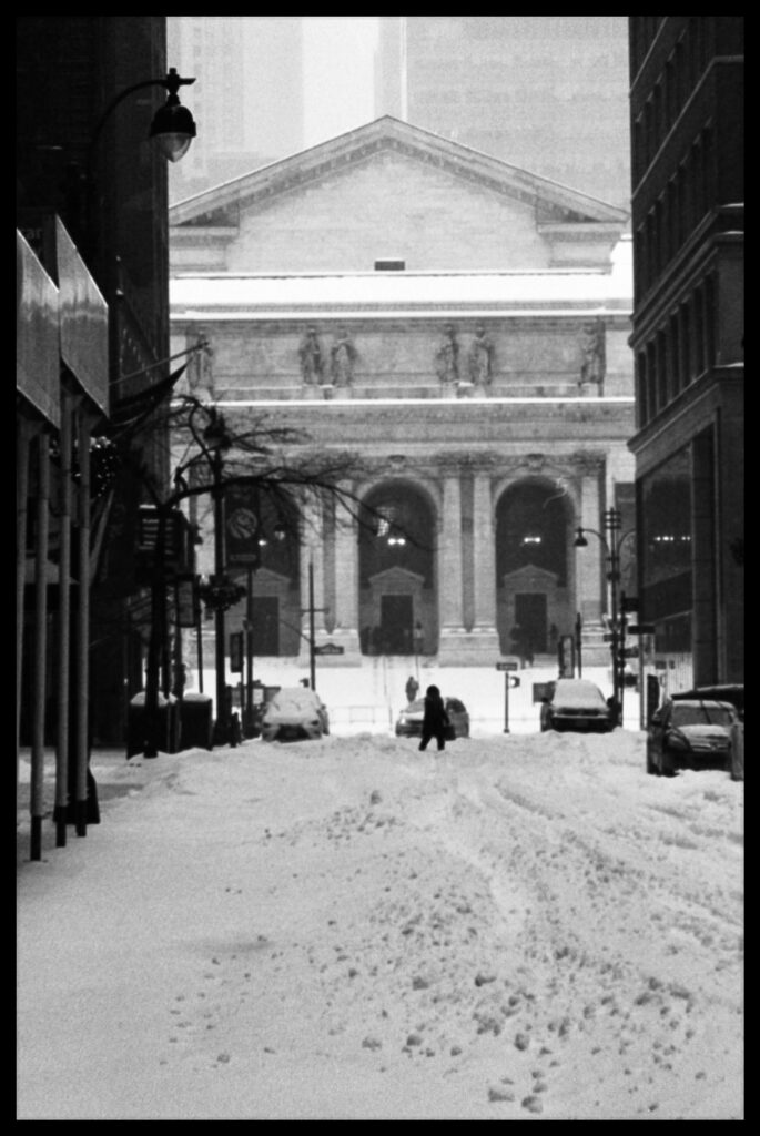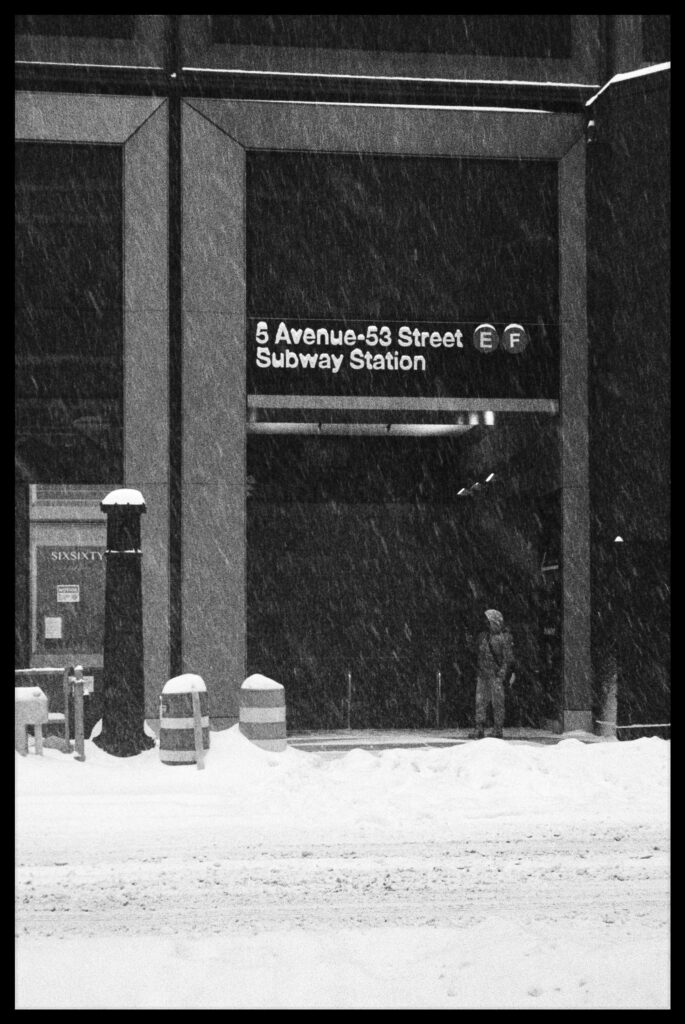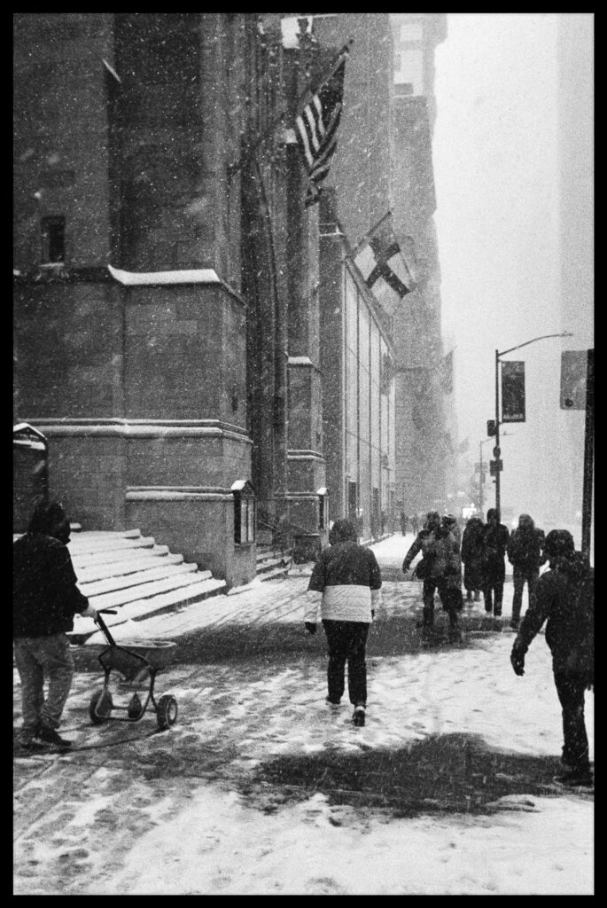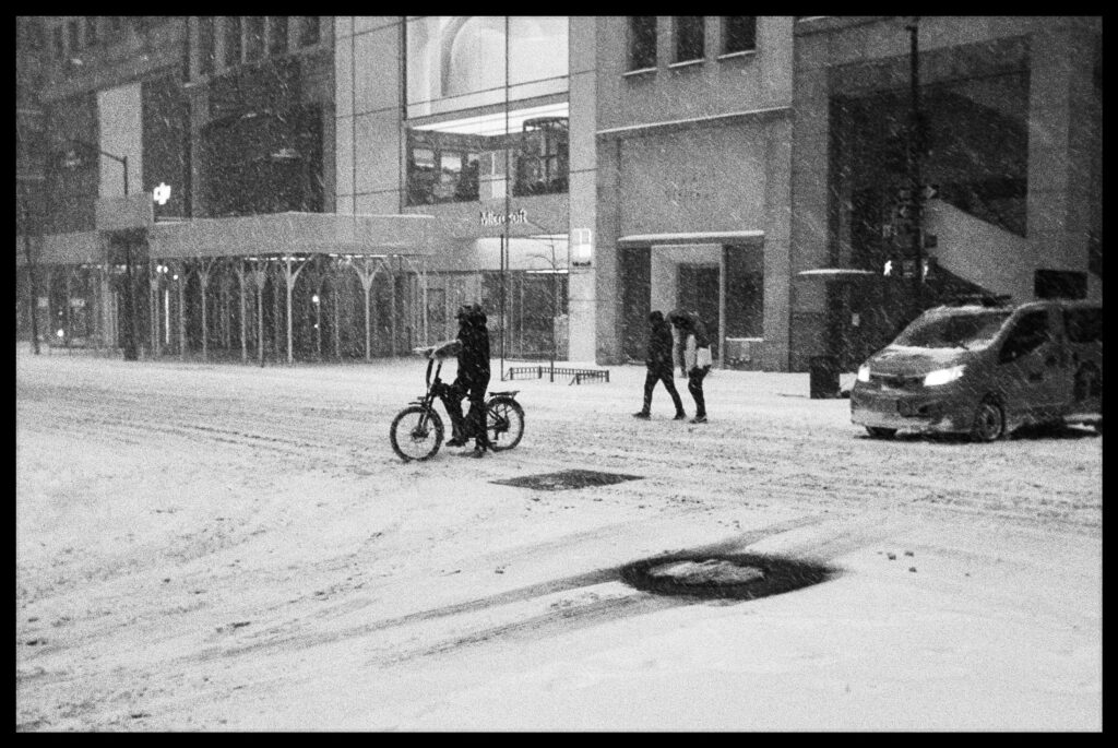 I took the bulk of the images in this post with my Leica M3, mounted with 2 classic thread-mount lenses: a Summaron 35mm f3.5 from 1950 and an Elmar 90mm f4 from 1946. (Though I love my Barnack Leicas, the M3’s larger body is easier to manage with gloved hands on freezing days). Ilford HP 5 plus, shot at ISO 320 and pulled slightly in HC-110 development to preserve the highlight details, rendered the monochrome streetscapes in a marvelous palette of gray. Most of my “people shots” happened on color, the ever-punchy Kodak UltraMax 400 to be specific, the better to evoke brightly-colored clothing and frozen cheeks. The night after the storm, with temperatures hovering near 15 degrees F (-9 celcius), I ventured out again with a seldom-used camera, my Bronica S2A, loaded with CineStill 400D and mounting the fantastic Zenzanon MC 40mm f4 wide-angle lens. As I arrived home—cold, elated—I remembered why I rarely use that camera: a defect in the film transport system in my copy that allows me to fire the shutter repeatedly without removing the darkslide, in the process wasting not only inspiration but a potentially unlimited supply of film (I lost a half a roll in this instance; the featured photo above is one of the few that survived).