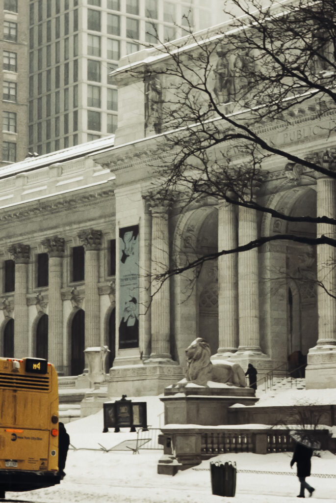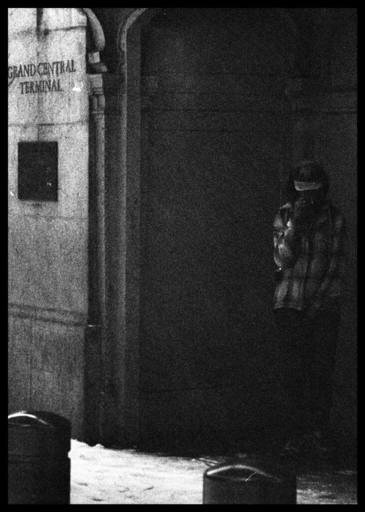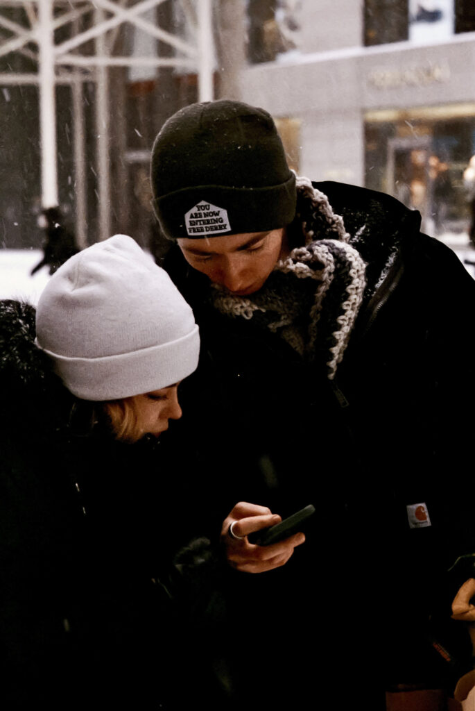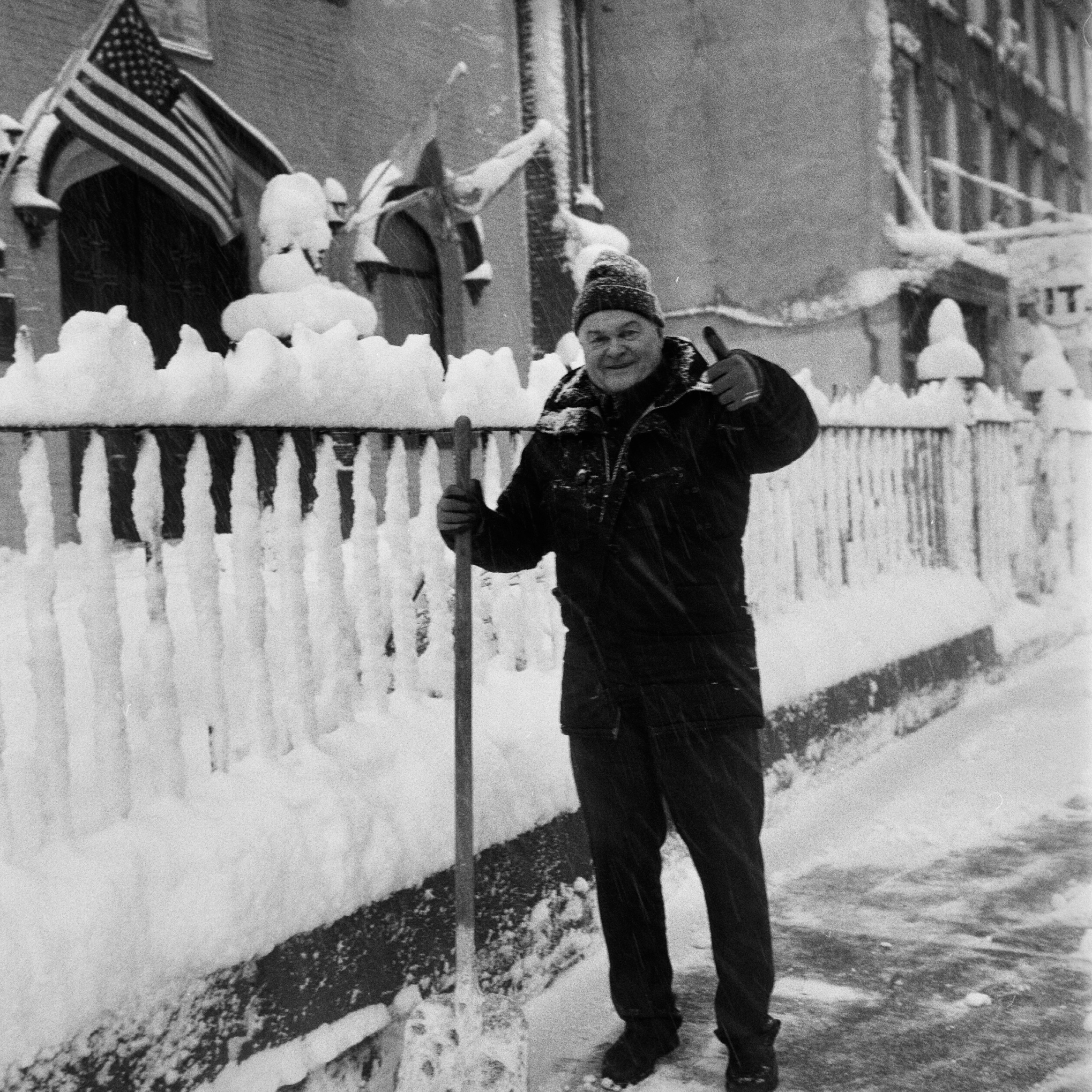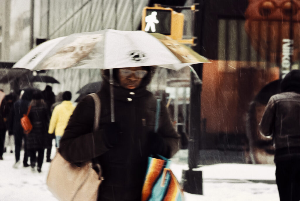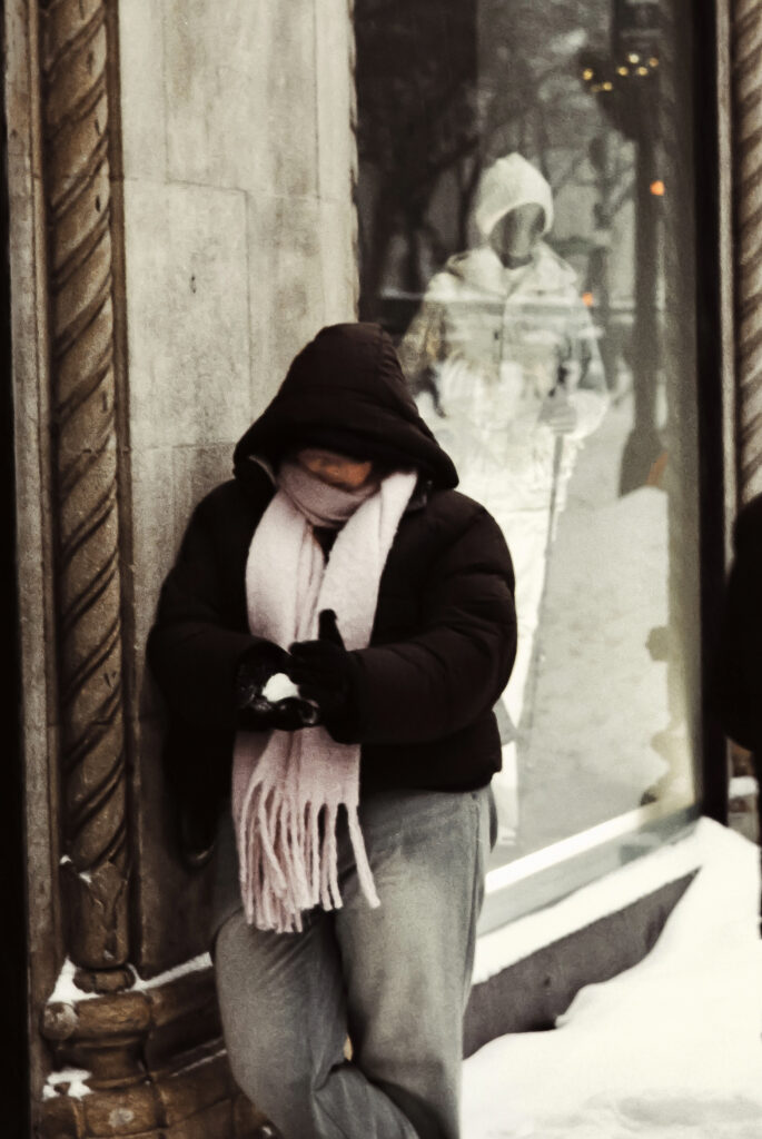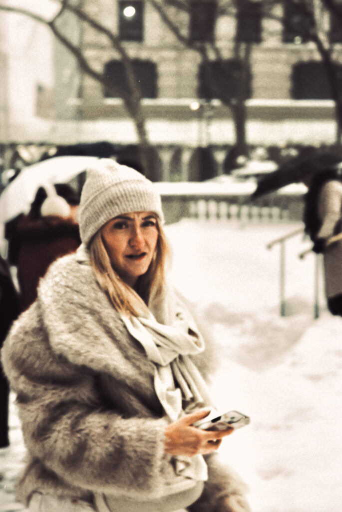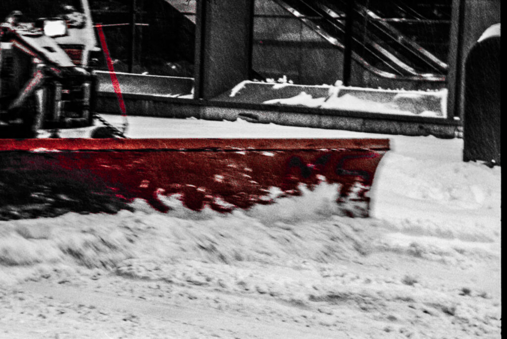 I took the bulk of the images in this post with my Leica M3, mounted with 2 classic thread-mount lenses: a Summaron 35mm f3.5 from 1950 and an Elmar 90mm f4 from 1946. (Though I love my Barnack Leicas, the M3’s larger body is easier to manage with gloved hands on freezing days). Ilford HP 5 plus, shot at ISO 320 and pulled slightly in HC-110 development to preserve the highlight details, rendered the monochrome streetscapes in a marvelous palette of gray. Most of my “people shots” happened on color, the ever-punchy Kodak UltraMax 400 to be specific, the better to evoke brightly-colored clothing and frozen cheeks. The night after the storm, with temperatures hovering near 15 degrees F (-9 celcius), I ventured out again with a seldom-used camera, my Bronica S2A, loaded with CineStill 400D and mounting the fantastic Zenzanon MC 40mm f4 wide-angle lens. As I arrived home—cold, elated—I remembered why I rarely use that camera: a defect in the film transport system in my copy that allows me to fire the shutter repeatedly without removing the darkslide, in the process wasting not only inspiration but a potentially unlimited supply of film (I lost a half a roll in this instance; the featured photo above is one of the few that survived).
