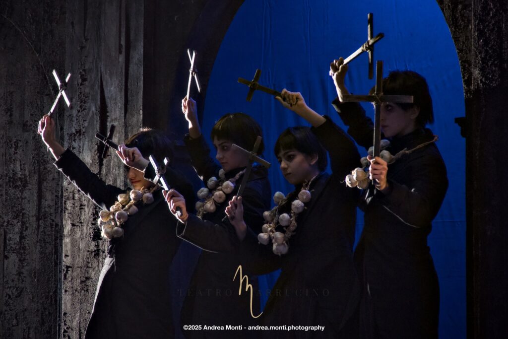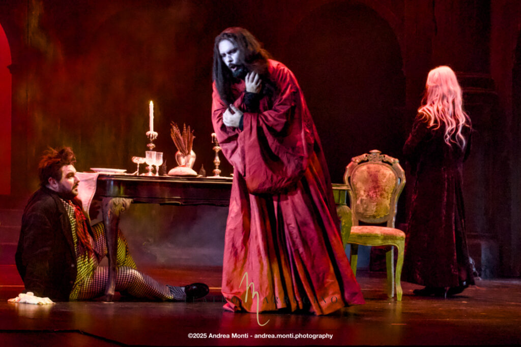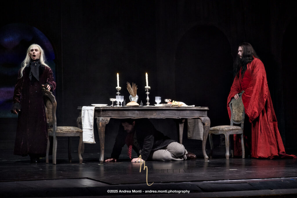 Being Don Giovanni a vampire, it’s no surprise that, when the time comes to confront him, Masetto is supported by people wearing garlic necklaces and crosses.