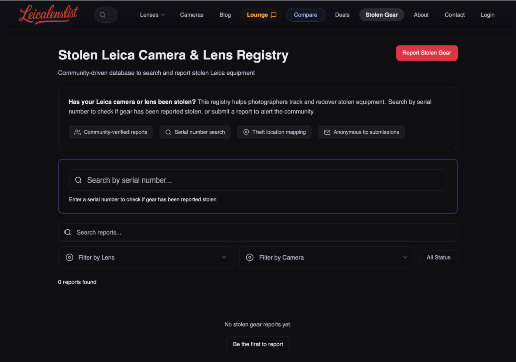 stolen-gear registry. You can report stolen items, search serial numbers, and see reports on a map. Not a fun feature, but felt like something the Leica community could actually use. At least – I often saw stolen gear posts on the internet, perhaps it would make sense to consolidate them into one place. Buyers could also check those posts before buying a camera or lens.