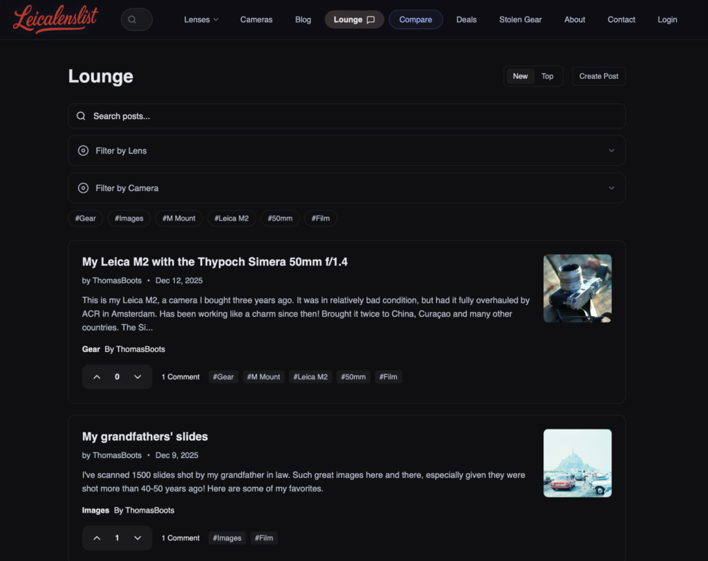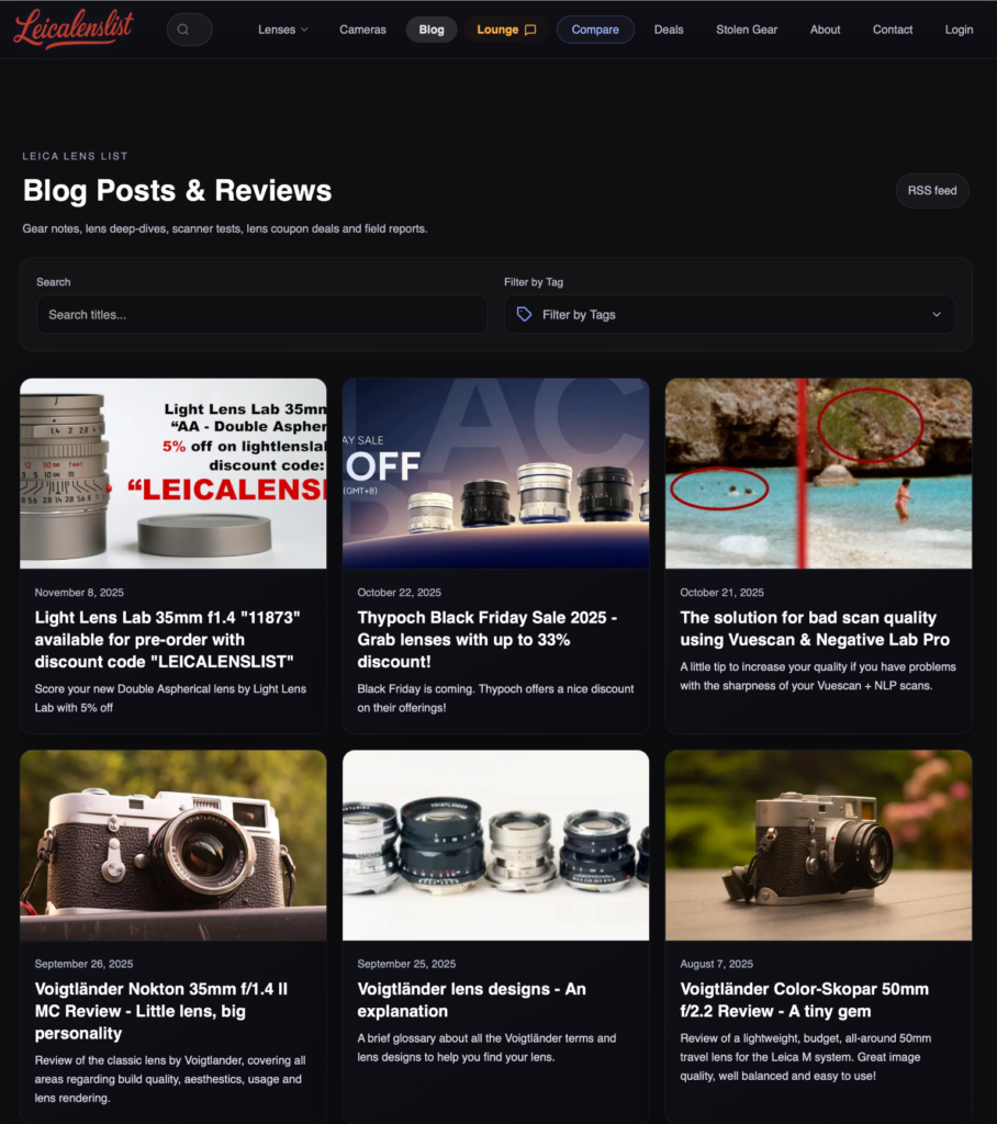 There are also focal-length overview pages (21/28/35/50/75/90), camera body pages, a small blog where I post lens reviews, accesory reviews and film/scanning thoughts, and a Lounge area where people can post and talk gear without pretending everything is a masterpiece.