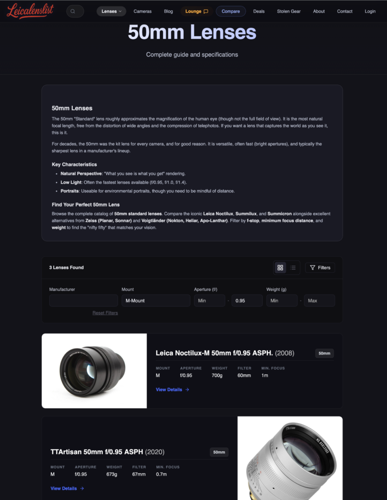 The main thing I wanted was better filtering. Not just by focal length and aperture, but by things that actually matter on a rangefinder. If you want to see all the compact 35mm lenses. Or compare small 50s that don’t stick out forever. Or find something lightweight because you actually carry the camera every day. You can do that without turning it into a research project.