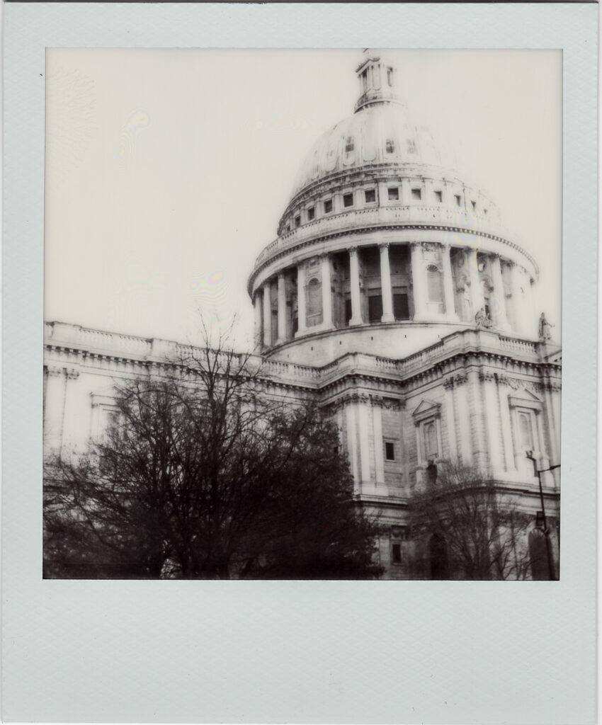 If you are comfortable with a dark bag, the range of cameras available to you is vast. That is because you can manually place the film into the camera in the dark and use an instant camera to process the image. Theimage of St. Paul’s Cathedral was taken on a 1914 camera using a sheet of Polaroid film, then processed in a Polaroid I-2 camera with the lens covered to prevent exposure. Fuji Instax, Polaroid, and Supersense instant film is processed by pushing or pulling the film through a set of rollers. This process busts pods filled with chemicals to develop and fix the image. To achieve this when shooting instant film in a non-instant camera, I place the exposed images back into a cartridge, insert the cartridge into a camera, and use the camera to run the film through the rollers, developing the film. This is done inside a dark bag or in a dark room.