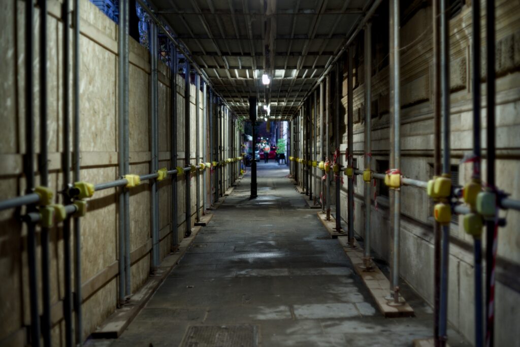 At dusk, the scaffold corridor is a test of distortion, contrast and flare. Post-production allowed the geometry to be managed and the details recovered so that areas in marginal light do not appear veiled or grey.