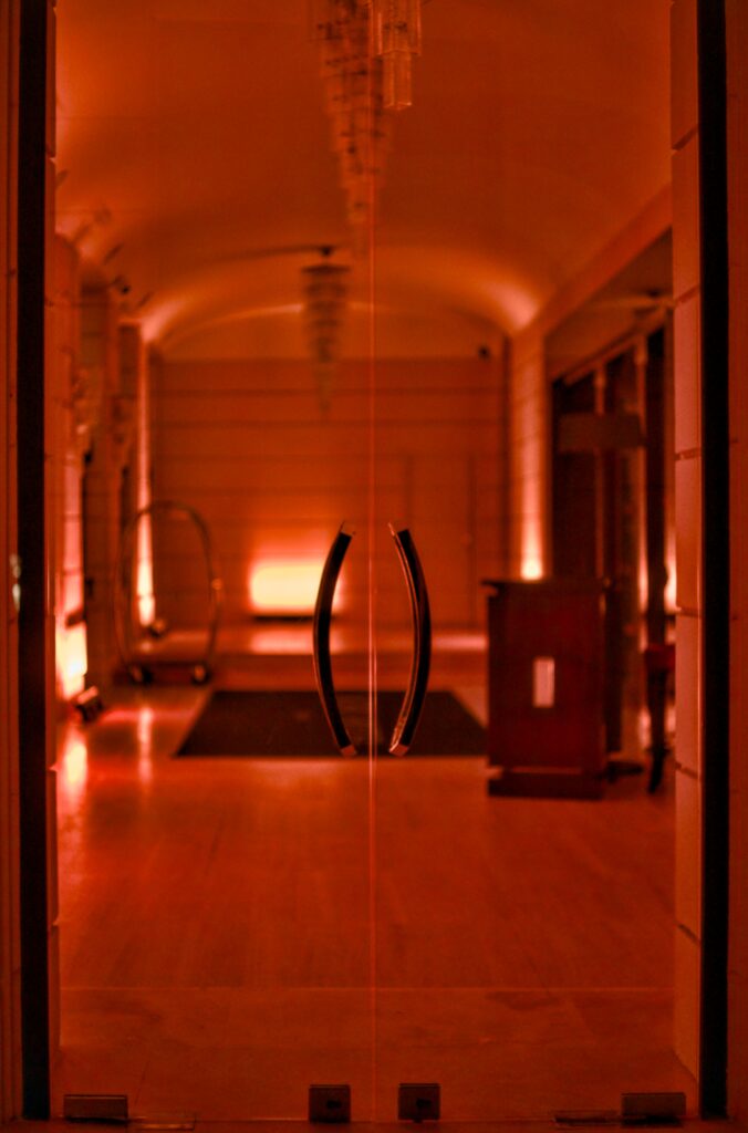 This photo of the side entrance to Rome Nobu is dominated by warm lighting and specular reflections. The flare resistance and tonal separation are both fairly good.