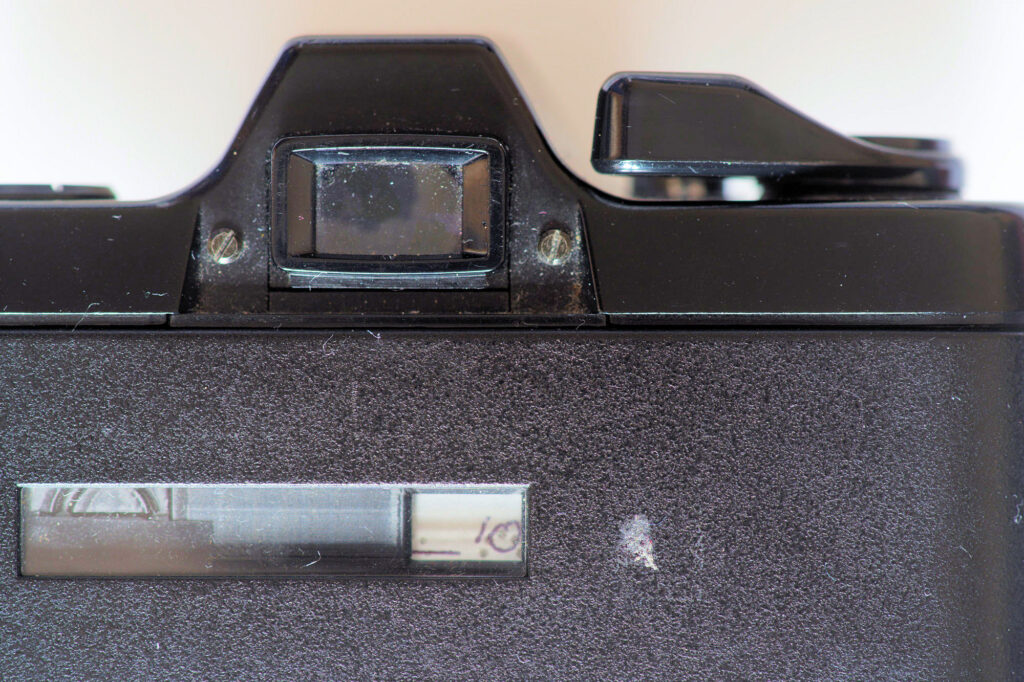 • If you don’t have visible backing paper, you get no indication that the film is being wound properly. You also don’t see how far through the film you are, or when you have reached the end of the film. I know Tony Warren caters for this by keeping count with a clicker in his pocket, but I don’t possess such diligence. What I’ve tended to do is to tape a short bit of a cocktail stick to the end of the film so that the camera will stop winding on when the end of the film is reached.