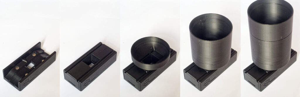 The lid of the base plate is held in place with magnets. A funnel slips into grooves on the lid, with tubes fitting on top of that to fully shield the top of the negative from extraneous light.