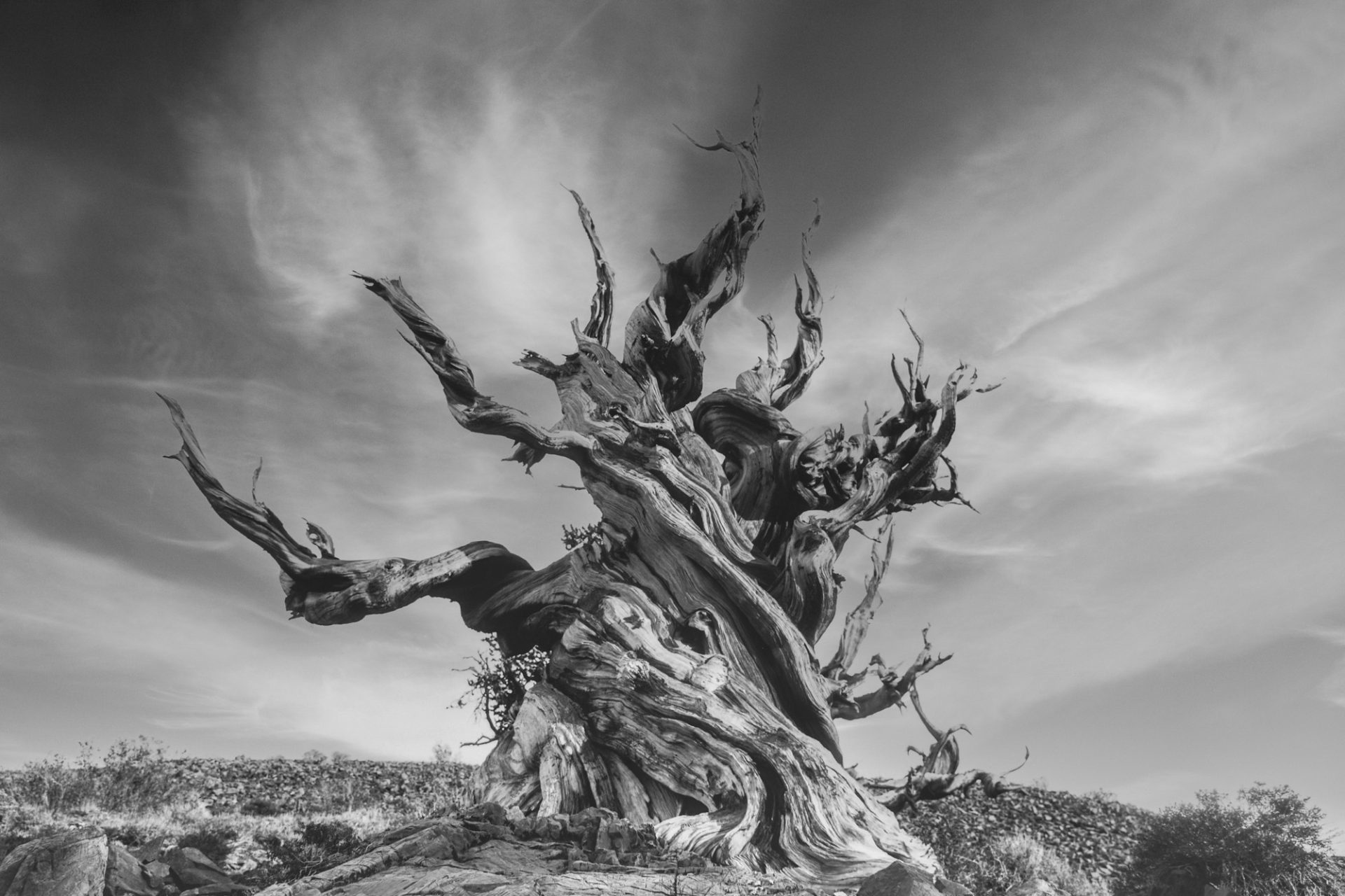 The second image is alongside the Owens Dry Lake with remnants of abandoned factories dotting the landscape. Moving north along Big Pine along White Mountain Road, to the Ancient Bristlecone Pine forest. The Brislecone pine trees are very unique in their shape and the harsh environment that they flourish in. The Great Basin bristlecone pines grows in only three locations, Utah, Nevada and California. They are known to be the oldest living trees with some exceeding 4000 years.