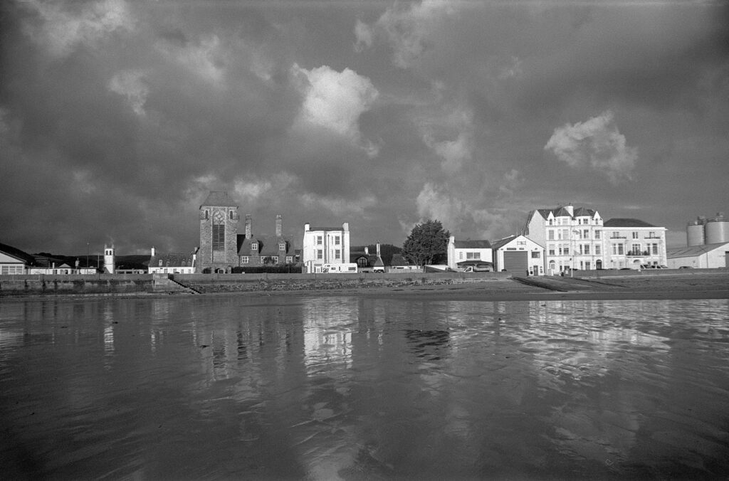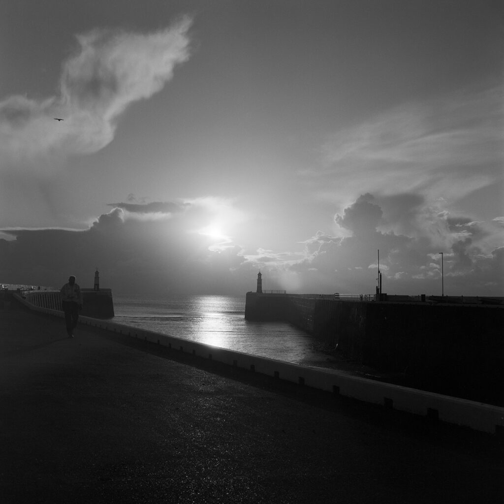 Here the 55mm lens facing similar problems to the little Kodak’s 35mm. Once again I had a hood for the other two lenses with this camera, but not the wide angle, a situation now also rectified with an order from an auction web site.  The 55mm has a tendency to vignette, so a crop helps. This lens also has a penchant for flare in contre-jour situations, though in fairness a lot was being asked here as the sun broke over the top of the cloud. I still like this frame even though the Harbour Keeper was caught in some of the flare.