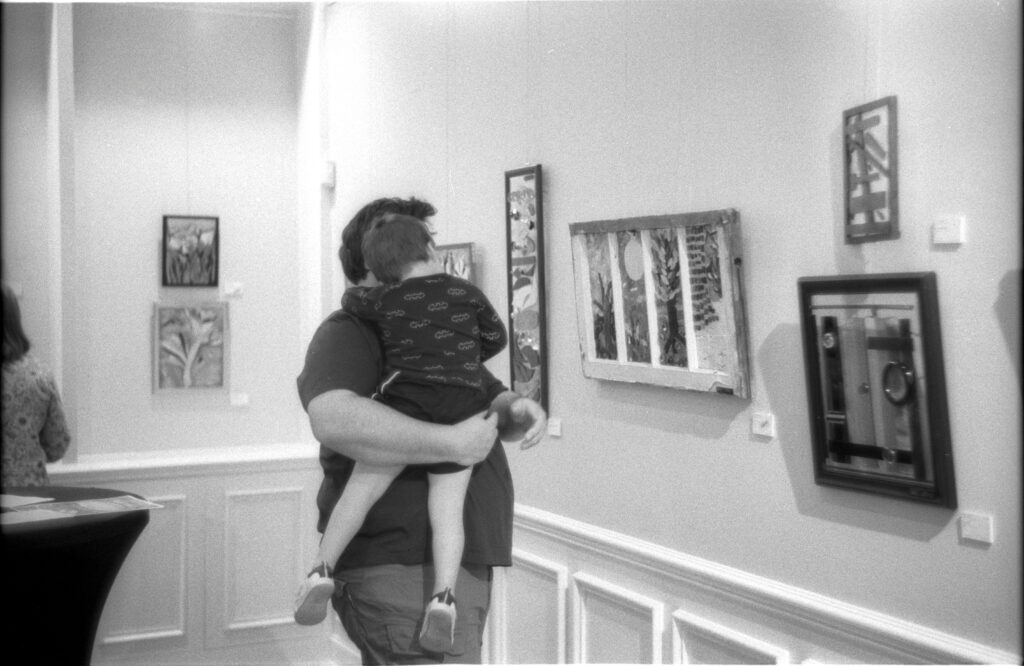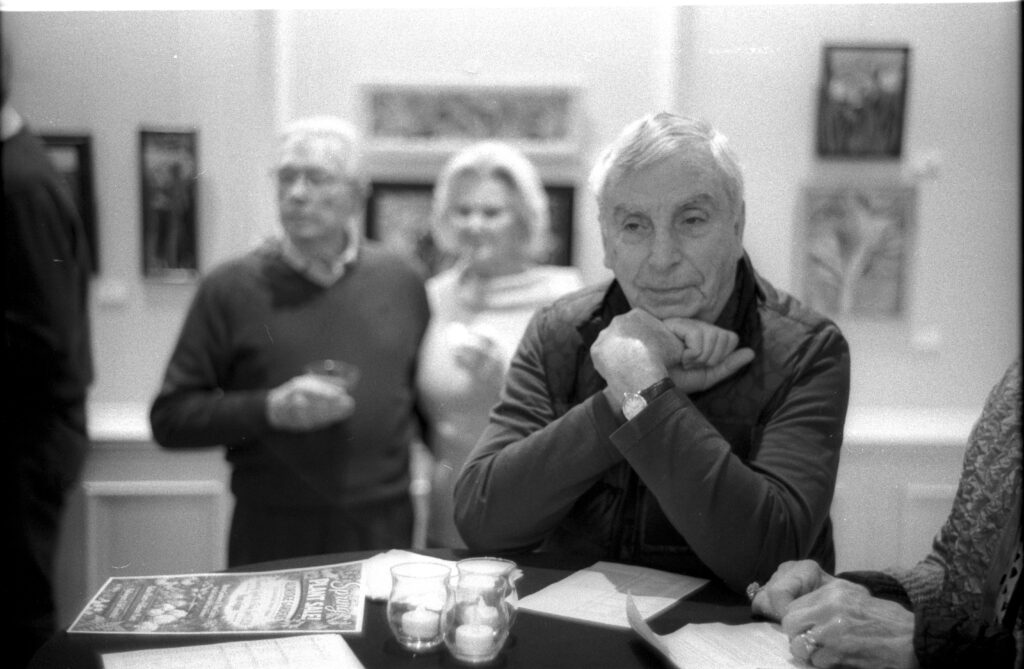 I arrived as the last rays of late winter sun were leaving the gardens. Outside, walking to the gallery, I grabbed a quick frame of a sculpture at 250 @ f8, testing the flair on the Sonnar. Inside at the reception I opened the Sonnar to f1.5, keeping my film at box speed and my shutter at 100th. The gallery is a tough place to shoot since the lighting is brighter on the walls than on faces thus making one decide between either shadowed faces or burned-out backgrounds.