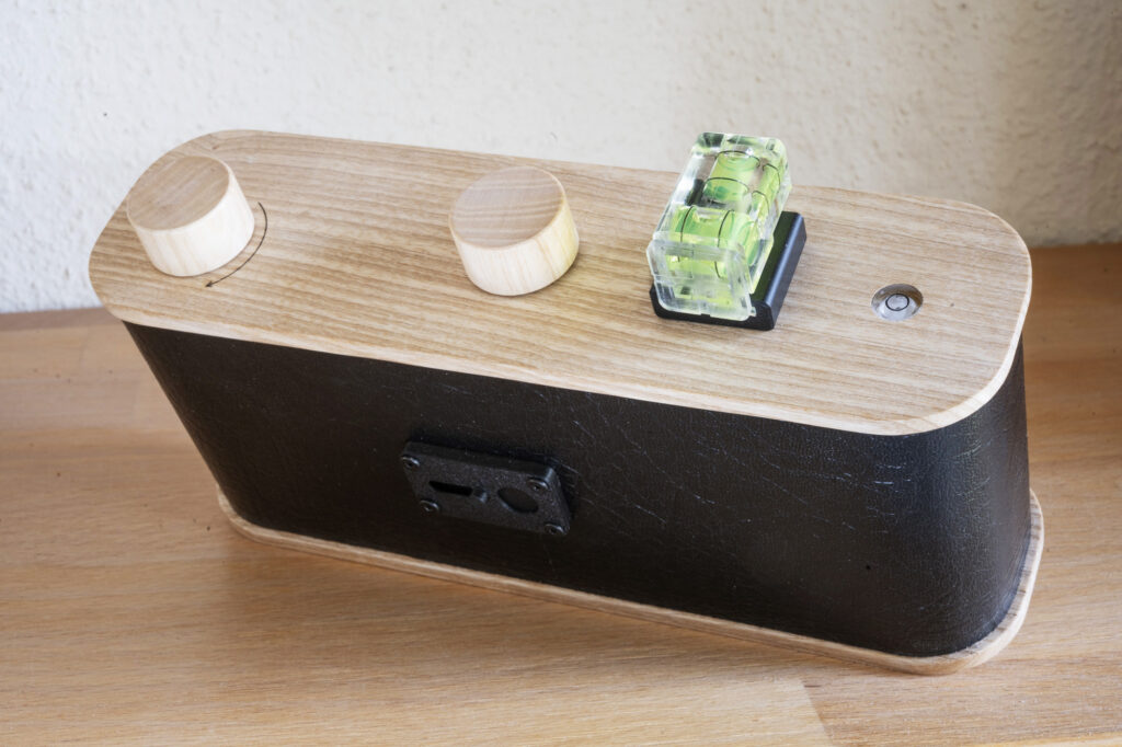 The camera is made by Philippe Leclerc from Bayeux, France. It exudes an air of minimalist design and solid precision manufacturing and is a joy to handle. The negative format has an aspect ratio of 2:1, the focal length is 45mm and the pinhole measures 0,25mm in diameter. This translates into an effective aperture of f/180 and the equivalent of a 12mm wide-angle lens on a 35mm full format camera. It features a 58mm screw mount for any filters you might want to use (a step-down ring makes it possible to use the more widely used 52mm filters), a tiny spirit level and a thread to attach the camera to a tripod.