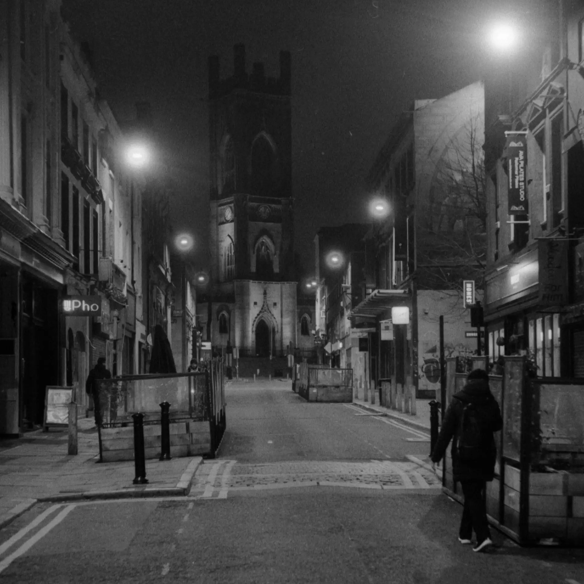 With this under my belt, when the next weekend came around, I was heading into the centre of Liverpool as the light completely faded into night for some slightly more peaceful shots. I’d been shooting some slide film at golden hour near the river, and had some high-speed colour film I wanted to test out with the city lights. Remembering the results of the pushed HP5+, I stuck another roll in the Kiev 4 rangefinder I had with me – deciding to push things even further (up to 12800 ASA) as I had a proper light meter with me and was shooting completely at night. My Gossen Lunasix Pro will happily meter up to 100,000 ASA (maybe next time!), and the recently-cleaned rangefinder patch in the Kiev was fairly straightforward to focus on any highlights in the shots.
