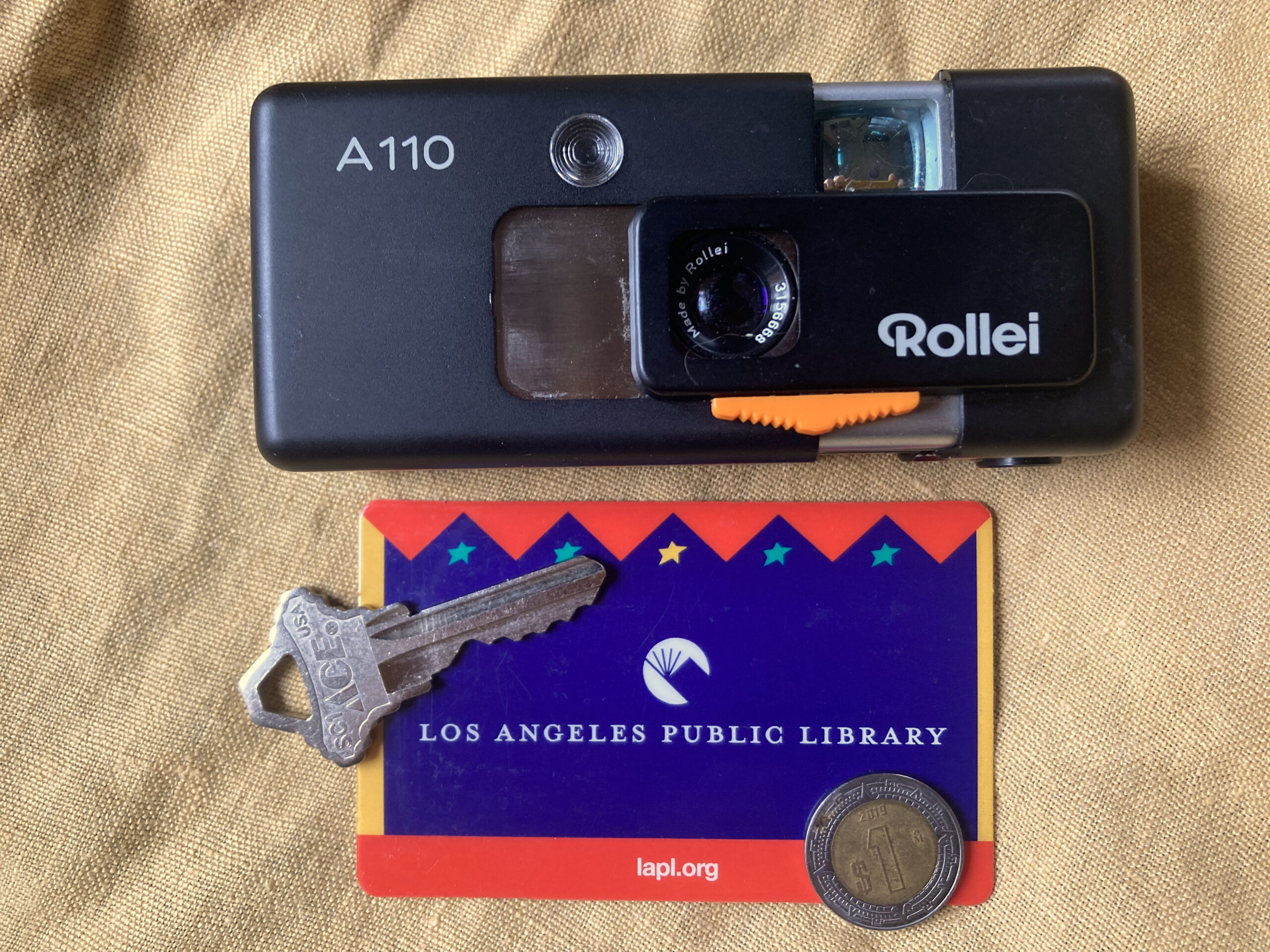 The Rollei A110 is an easy carry. Without the ubiquitous chain, I managed to hook a removable strap that works, albeit ugly and out of scale. Ready to go with one camera in hand loaded with b/w and the other cossetted in a cross body bag along with an Altoids tin containing the other cartridge.