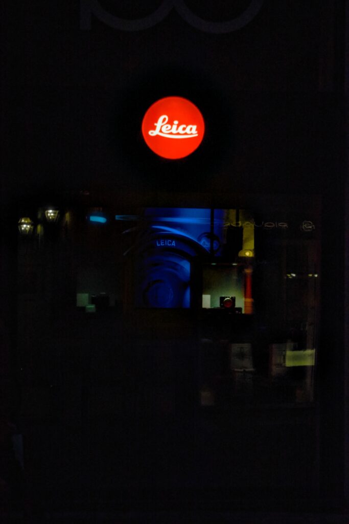 This photo of the Leica store display in Via dei Due Macelli, Rome, is a flare torture test. The bright, emissive Leica sign against a dark background, plus additional reflections and obstructions, creates a challenging scenario. The outcome is that the blacks lift and deep separation is lost. Ghosting appears near the top, as well as a general haze around the sign. The highlight bloom around the red disc and the white script demonstrate how spherical aberration and flare interact. In short, this Triotar is not well suited to handheld, high-contrast nocturnes photography at F4.