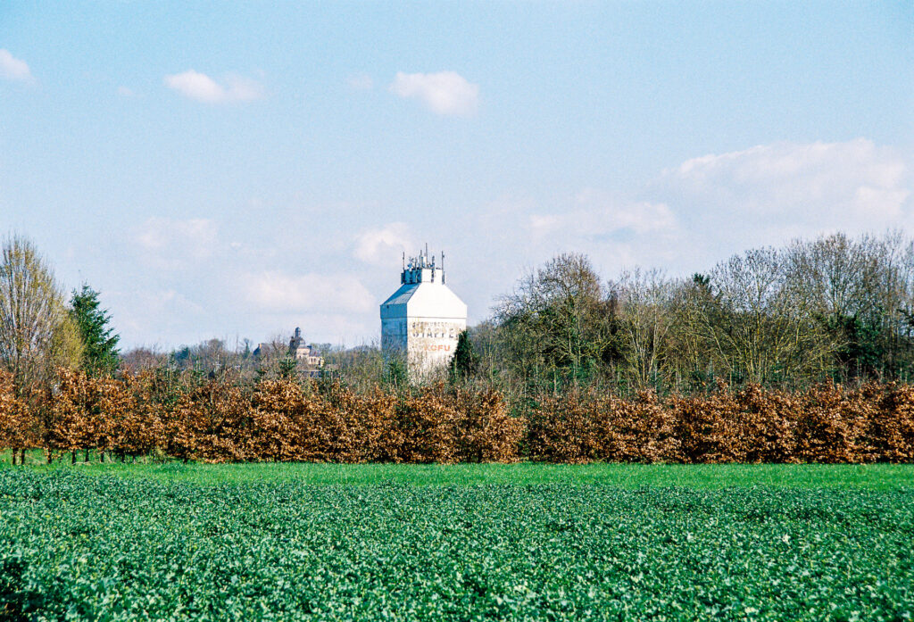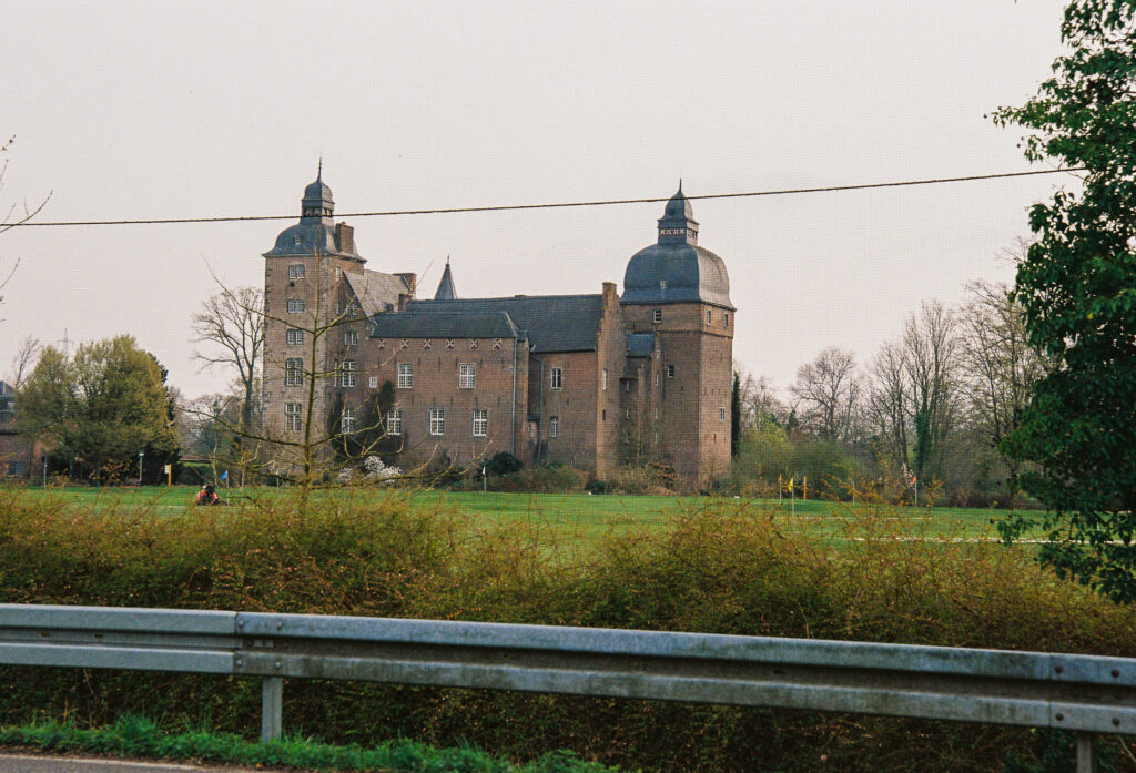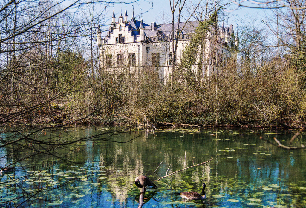 The castle is privately owned; the extensive grounds include an 18-hole golf course belonging to a golf club, which is also permitted to use the outbuildings for its own purposes. I took the photo from the cycle path of a district road that runs alongside the grounds. This is the only spot from which you can photograph the castle in its entirety. It’s not a telephone line that spoils the photo, but the edge of the ball-catcher net. Golfers do have the odd wayward shot, and analogue photographers don’t have to retouch everything away.