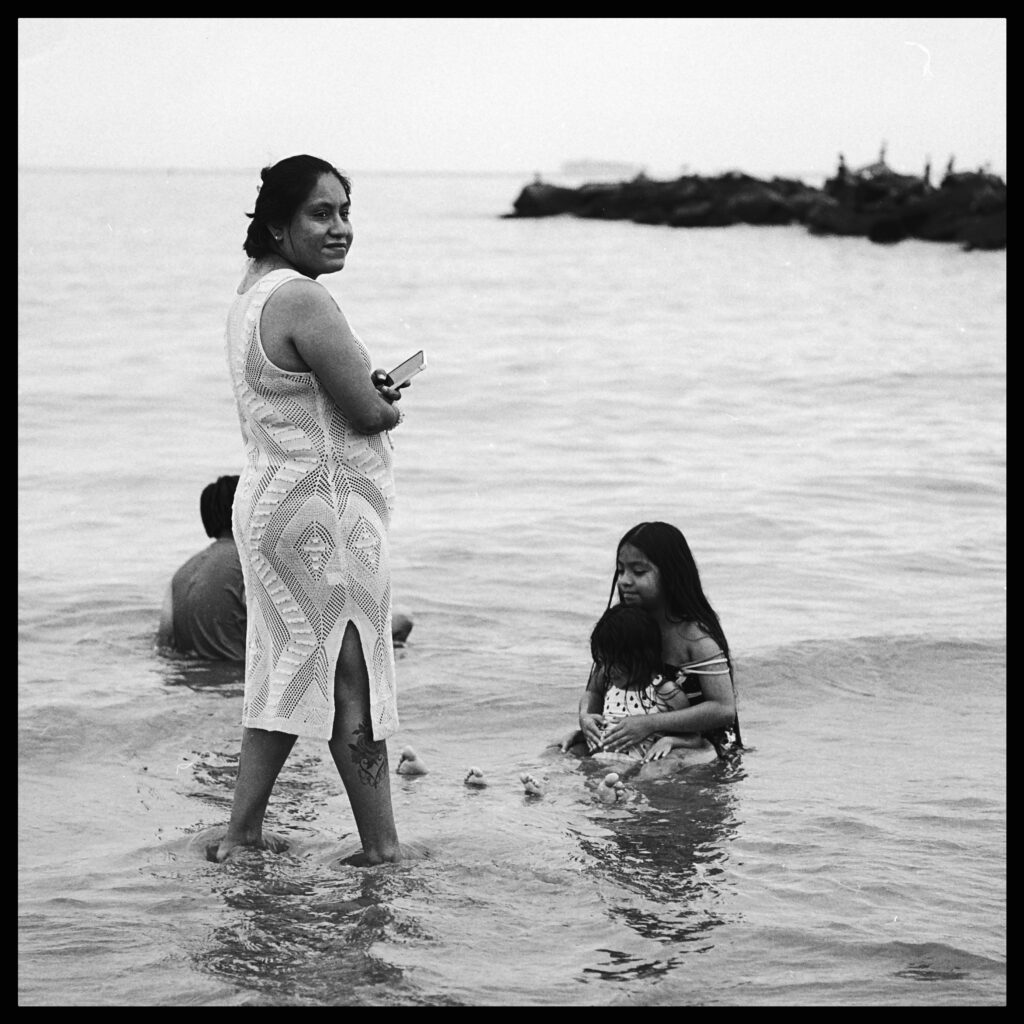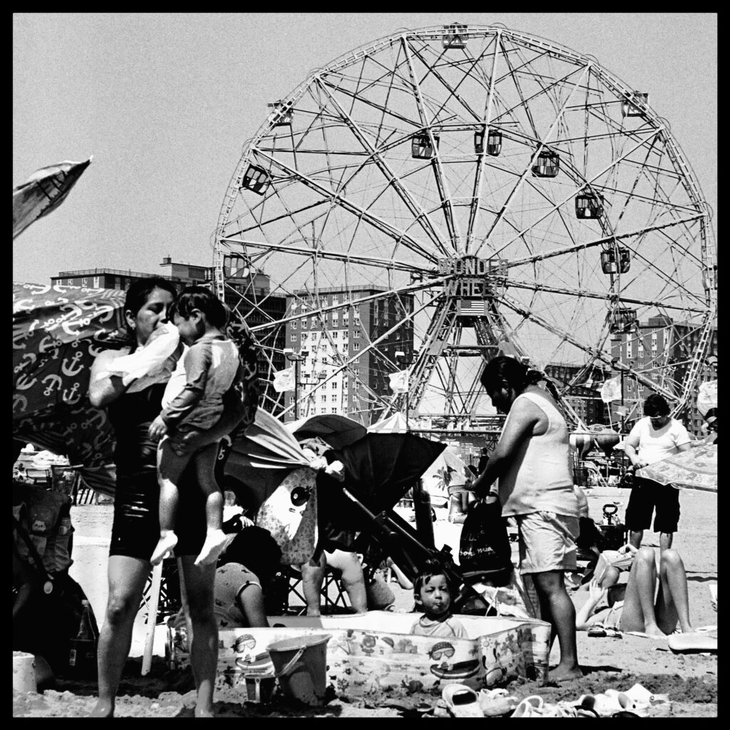 In recent years my visits to Coney Island have unfolded in the company of my Tele-Rolleiflex, a camera tailor-made for the setting. Its telephoto lens, shot from a waist-level position, allows me to get close to the action without crowding my subjects. More than any other camera in my collection, its double-barreled snout also marks me as a character— “Mister Photographer,” as one Puerto Rican woman of a certain age (not so very far from my own) said as she called out to me on a recent visit. She is the beaming lady, second from the right, in the photo below.