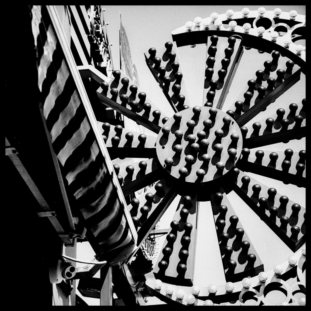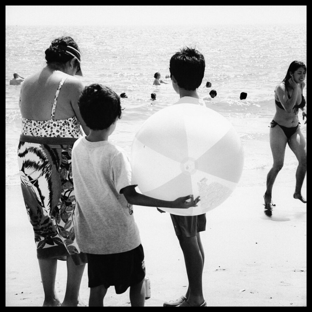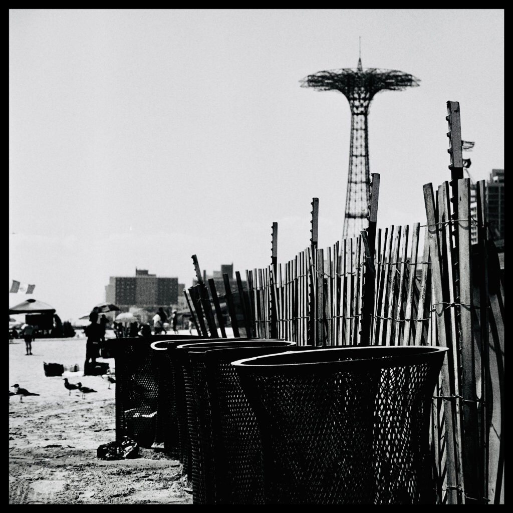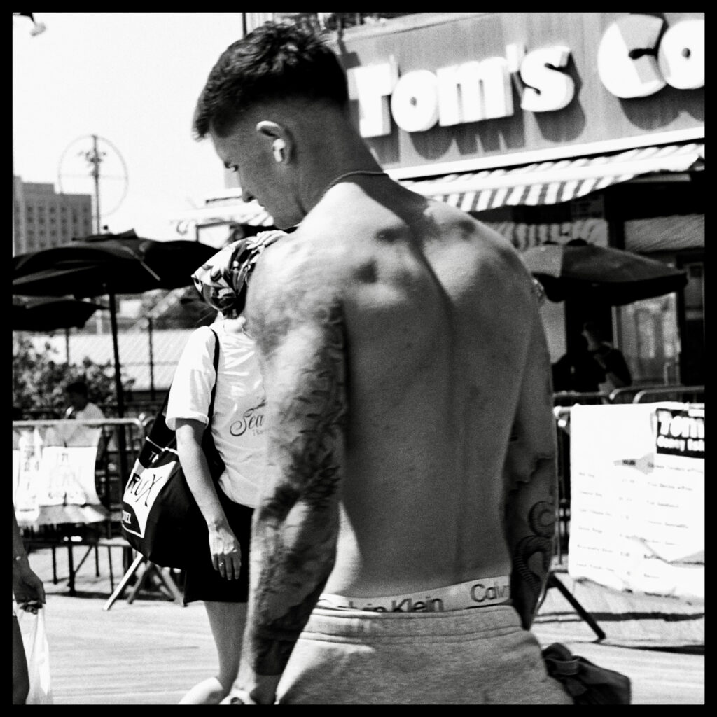 The “film roll” of frames below is composed from photos taken on two visits to Coney Island one year apart. In summer 2024 I made exposures mid-morning, when the light was still soft and the beach was filled with young children and their grandparents, many of them immigrants from Eastern Europe, Russia and Latin America. The later outing, this past August, occured in the heat of the day, with abundant exposed flesh and the beach and boardwalk under relentless direct sunlight having the quality of a great broiling bazaar (epitomized in the featured image at the top). The commodity peddled?