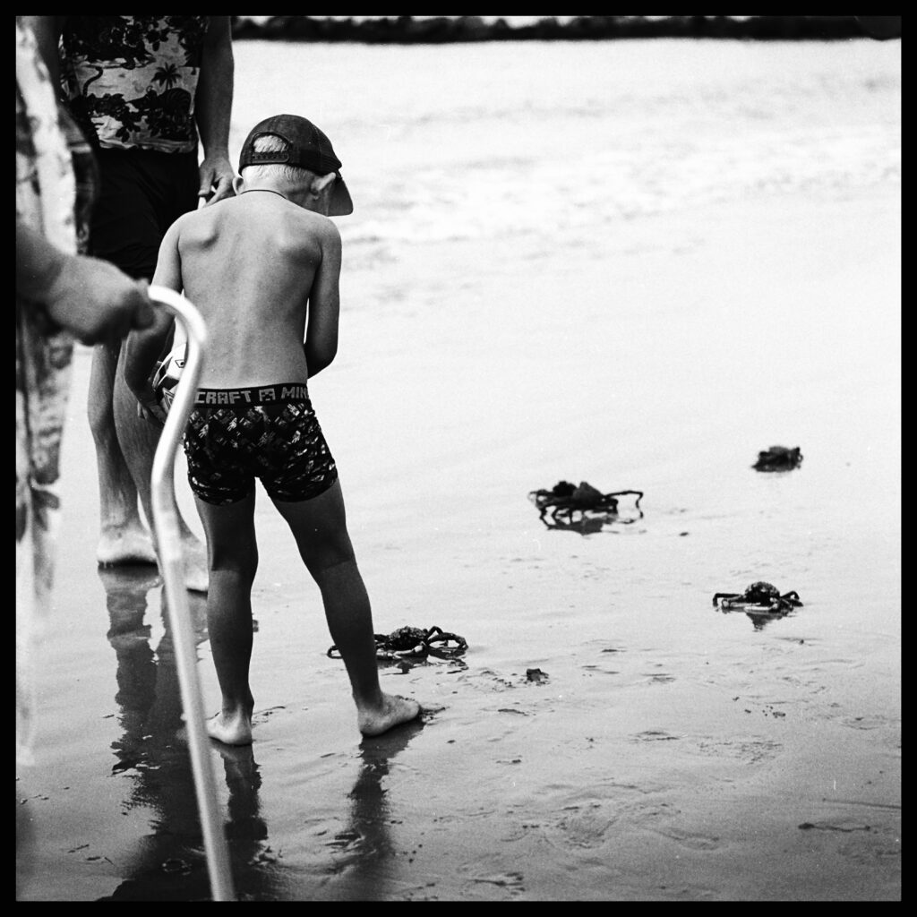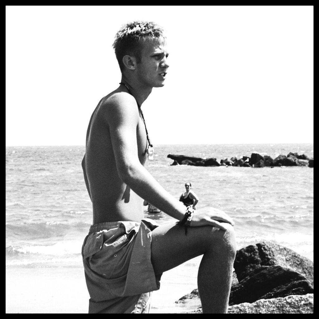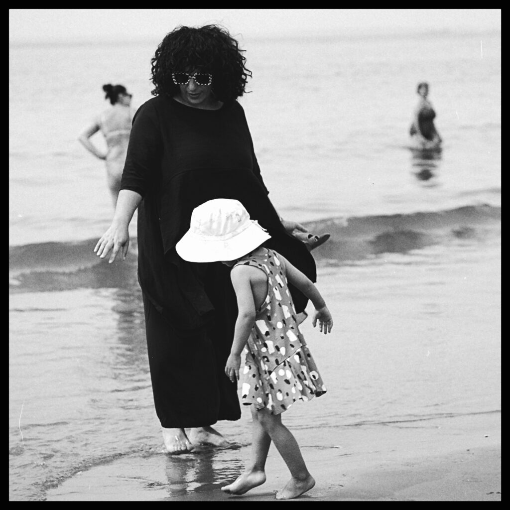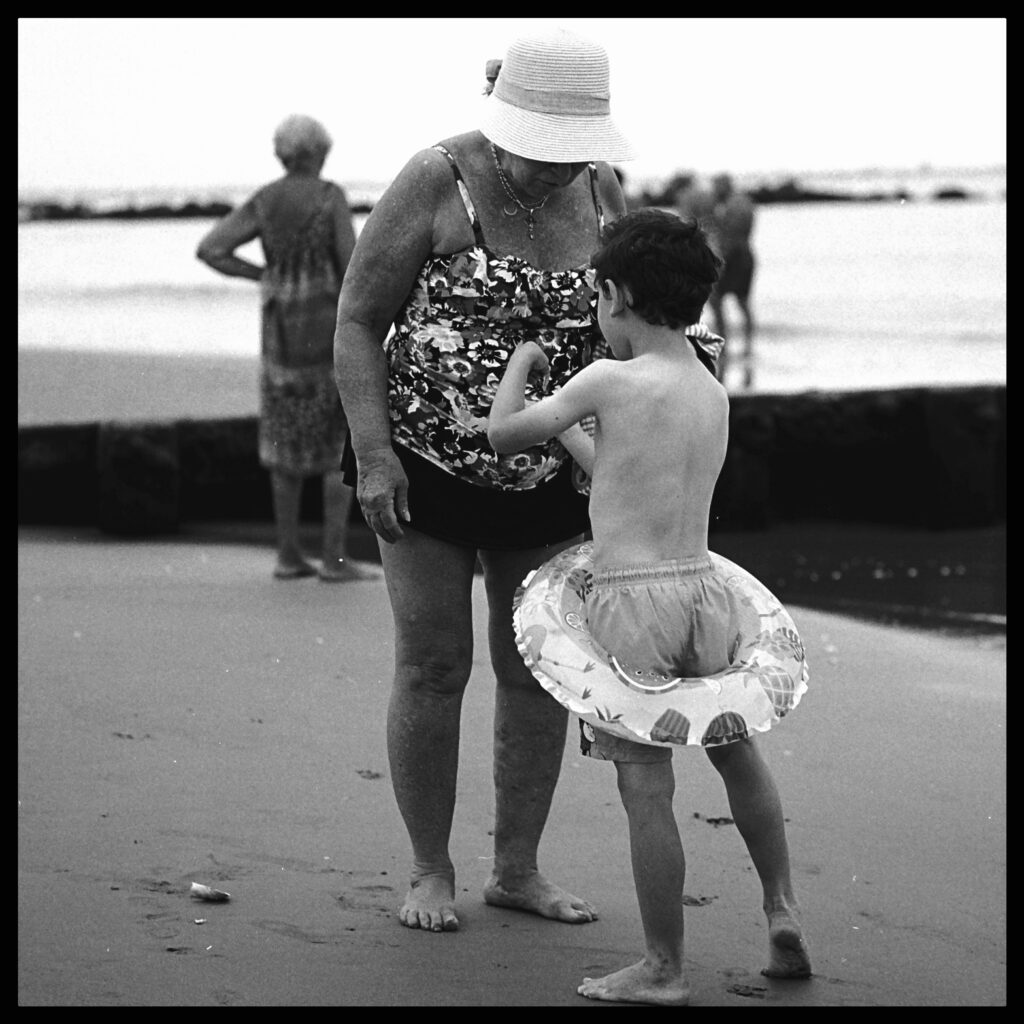 The “film roll” of frames below is composed from photos taken on two visits to Coney Island one year apart. In summer 2024 I made exposures mid-morning, when the light was still soft and the beach was filled with young children and their grandparents, many of them immigrants from Eastern Europe, Russia and Latin America. The later outing, this past August, occured in the heat of the day, with abundant exposed flesh and the beach and boardwalk under relentless direct sunlight having the quality of a great broiling bazaar (epitomized in the featured image at the top). The commodity peddled?