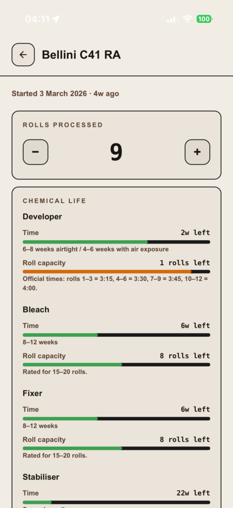 It also tracks your chemistry properly. Not just “how many rolls roughly,” but where you actually are in its lifespan and it adjusts your development time to reflect that. Plus if you want to experiment further it also allows you to push process even with chemicals that are not at their freshest. So instead of hoping your process is still within tolerance… you stay within it.