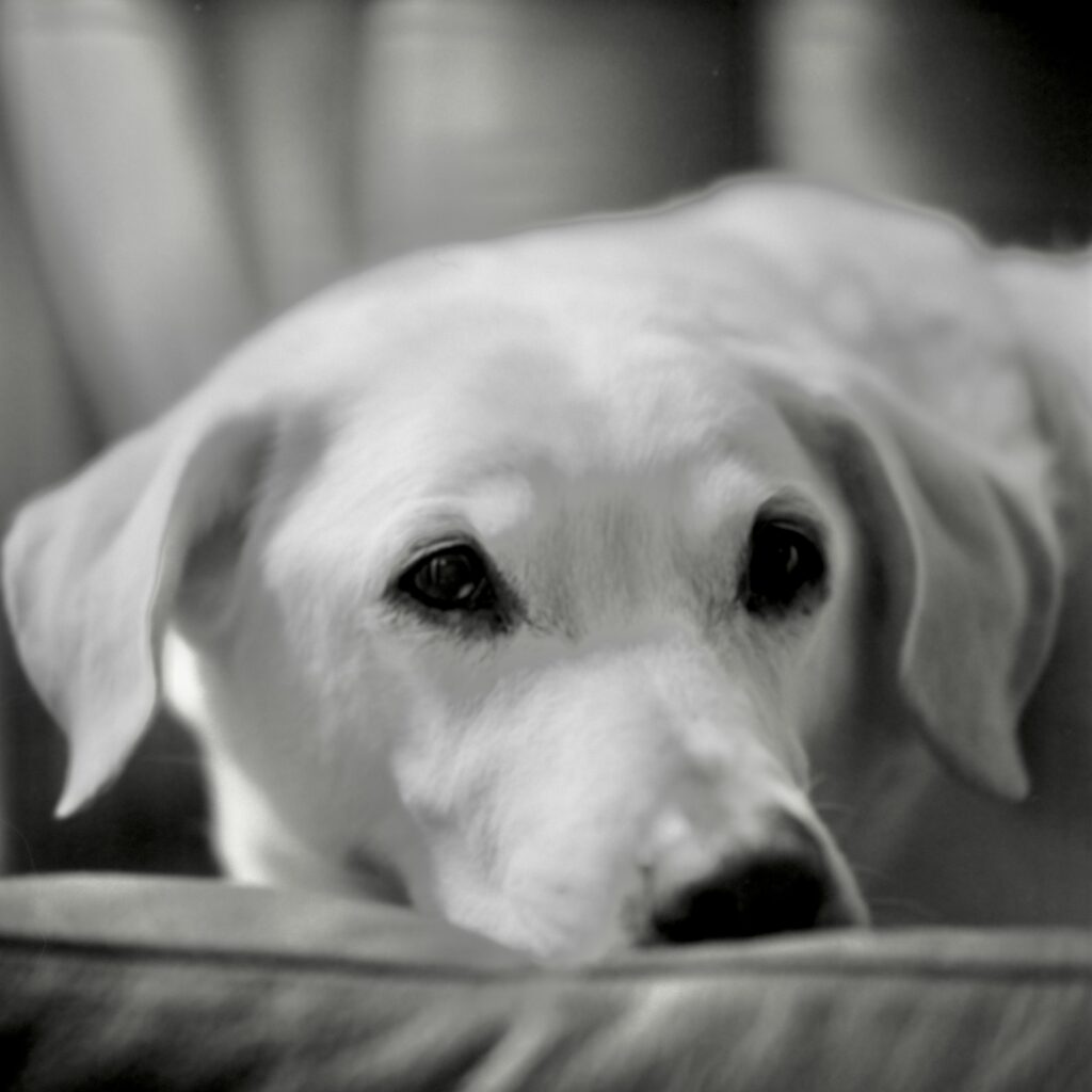 I’m not exaggerating when I say that I had a profound experience when I saw Kipling and his pinecones on the black and white scan. It was seeing this image that caused me to cross the line from being someone who takes photos as an excuse to fondle analog cameras to someone who is compelled to take photos. To be honest, this change is in some ways less rewarding. Like an addict, I keep chasing after the feeling I got from that pinecone photo. Sometimes I find it, but these moments are few and far between. I can go through many rolls of film over weeks, or even months, before I even get close to it. I’ve even tried to recreate the image by getting Kip to hold other things, like apples or walnuts or tennis balls. But, of course, the outcome is contrived and unspontaneous.