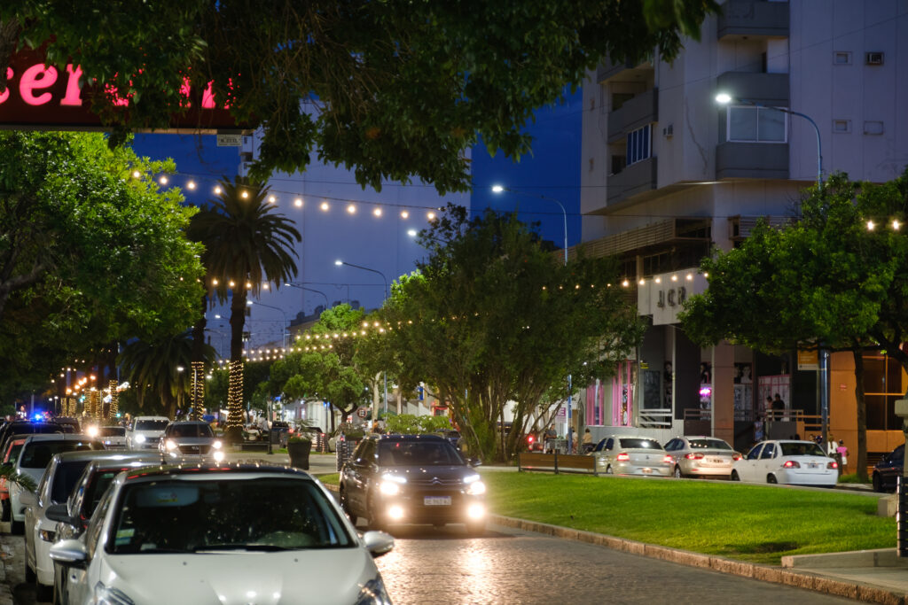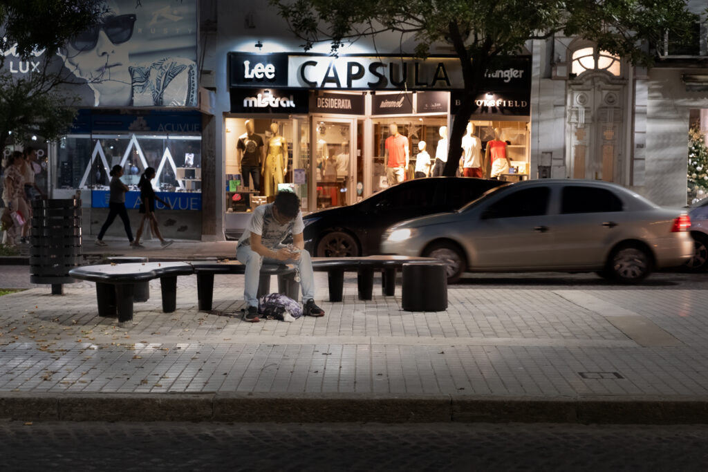 “Avenida Santa Fe”, Rafaela. As the heat eases after sunset, people gather along Main Street. Cobblestones, softer light, slower movement.